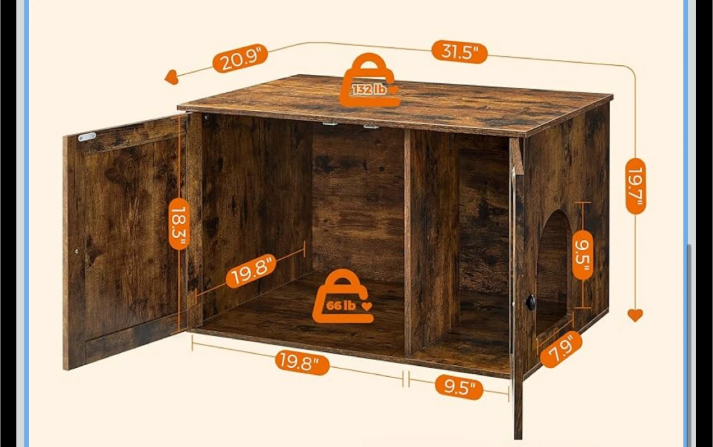 The dimensions are approximately 31.5" x 20.9" x 19.7". It features a divided interior and a cute little entrance for your furry friend