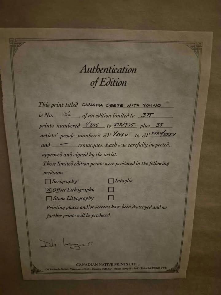 Buy & SellSigned framed print by Don Li LegerSigned framed print by Don Li Leger$80Family of Canada Geese, parents with 4 goslings, size is 38" (L), 25" (H). Signed by the artist, print 132 of 375.0 chats·0 favorites·5 viewsSELLERDeeDeeCentral Lonsdale100 reviewsWHERE TO MEETCheck Location