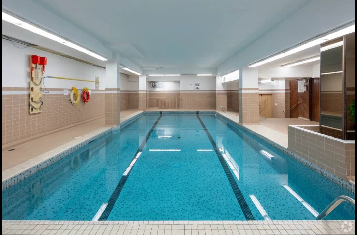 The building amenities include a pool, a gym, a sauna, and a pool table for entertainment. The apartment is ideally located near public transit, restaurants, and shops.