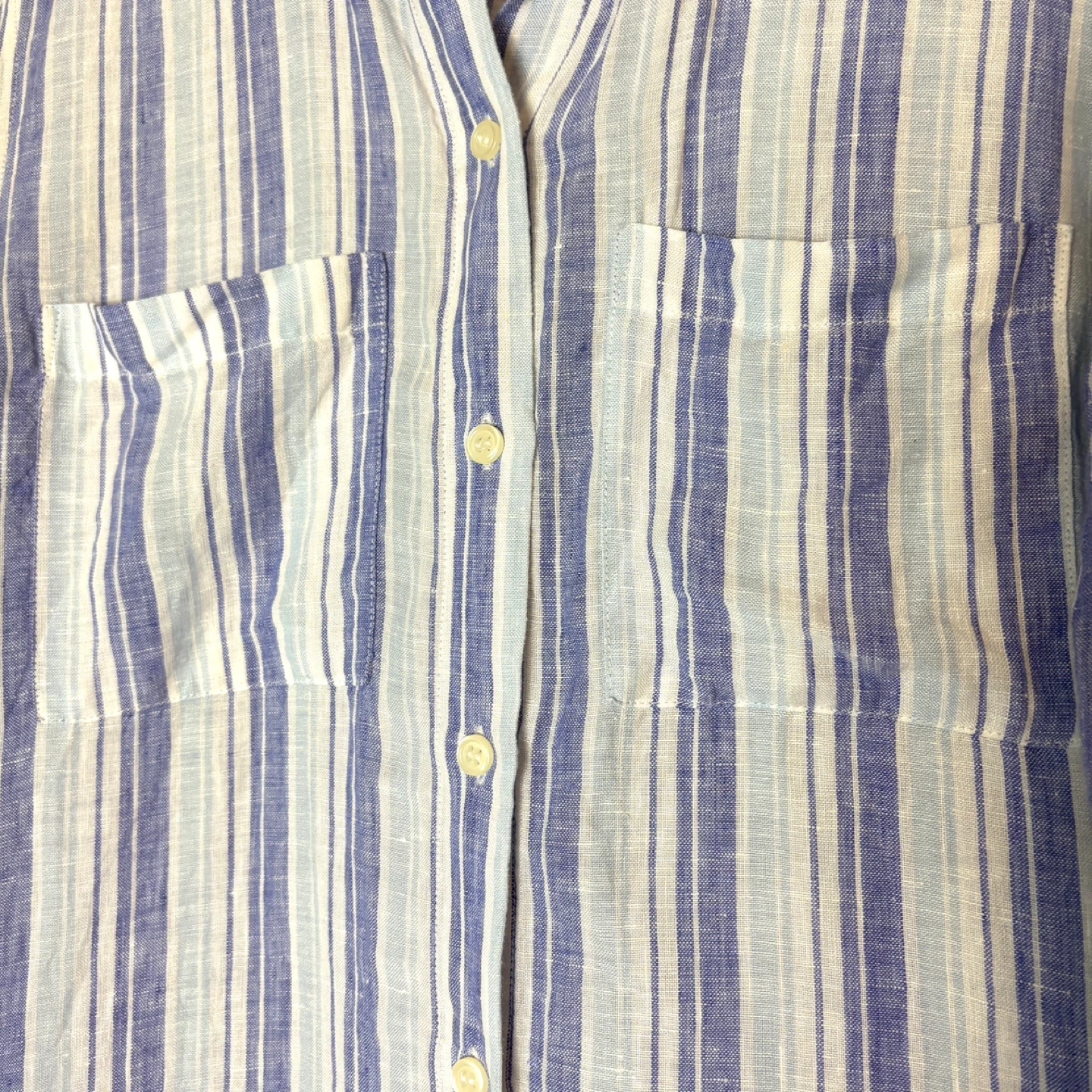 Crisp and breathable 100% linen button-down shirt by Lord & Taylor in excellent condition. Features a blue, purple, and white vertical stripe pattern, long sleeves with button cuffs, two chest pockets, and a curved hemline for an easy, relaxed fit. Perfect for layering, travel, office, or everyday wear.