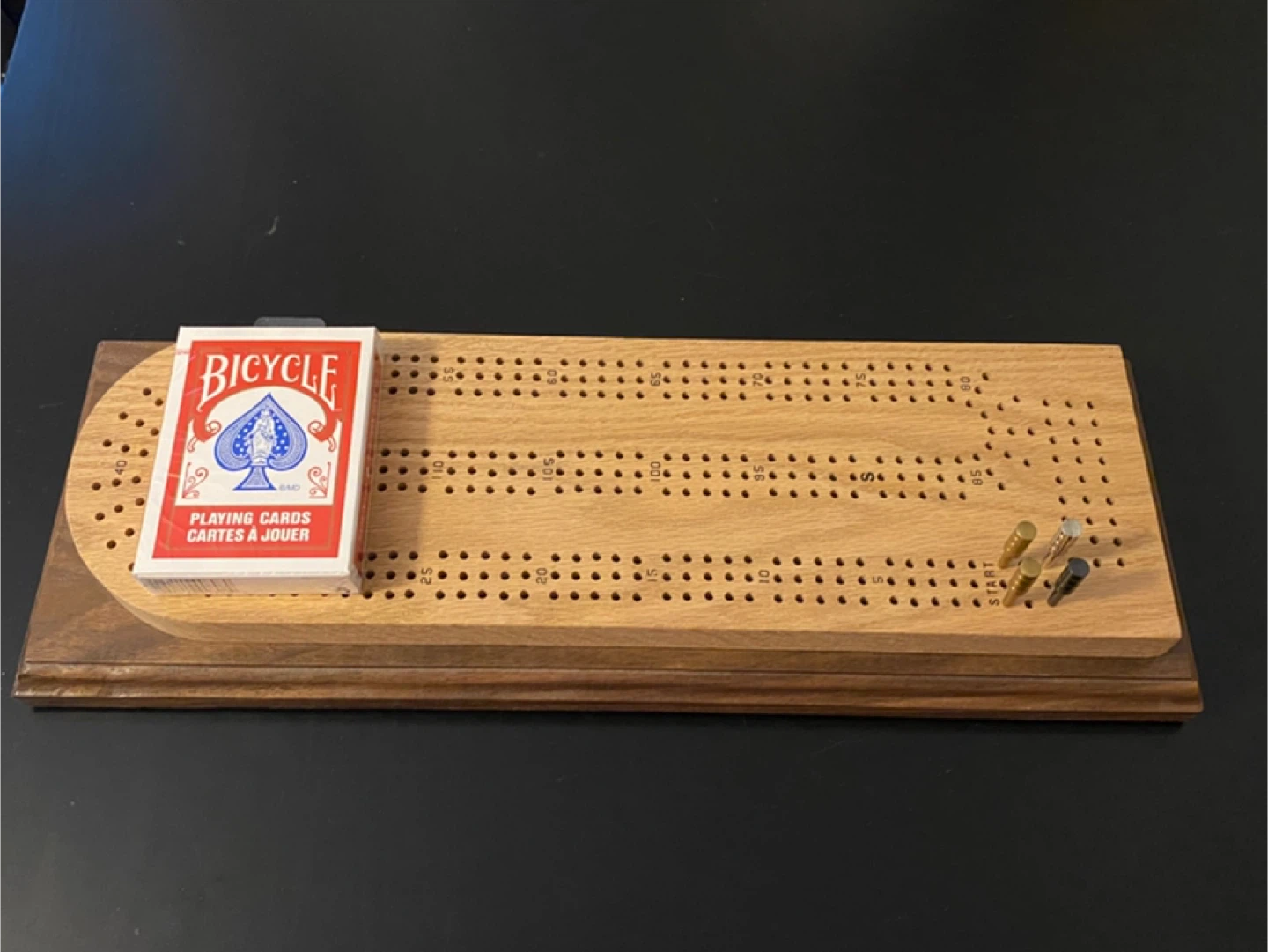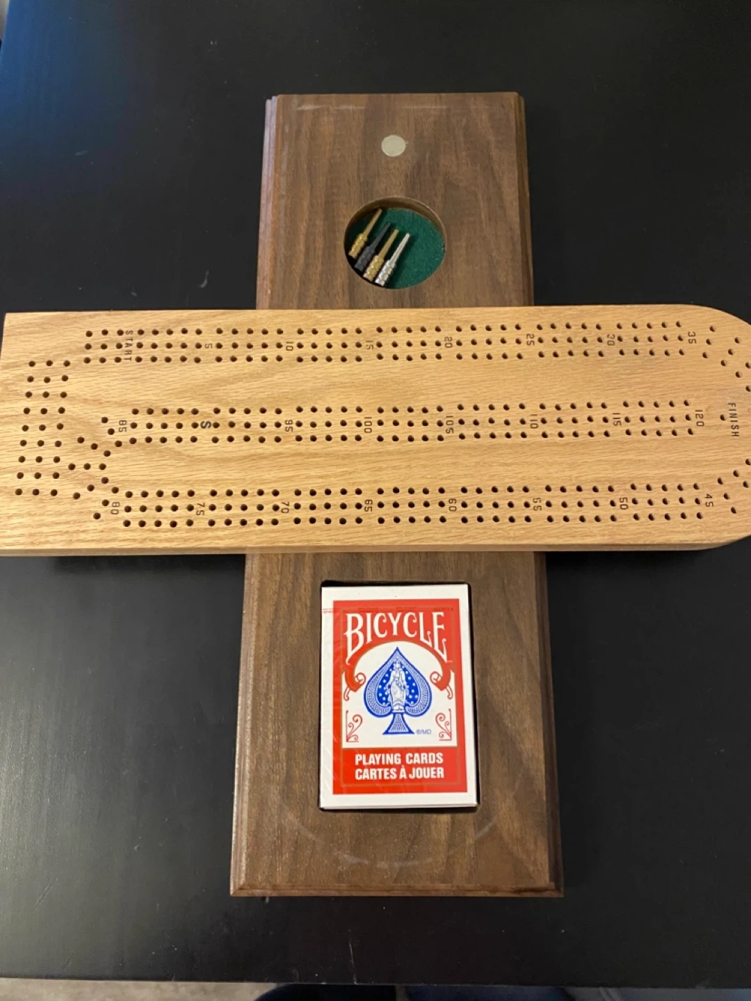 Selling a lovely NEW solid wood cribbage board that comes with a deck of sealed Bicycle playing cards.