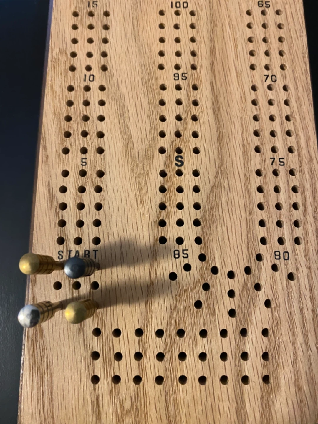 This crib board is higher than most crib boards as it sits on a second board that when rotated it reveals the storage compartment for the playing cards and pegs!