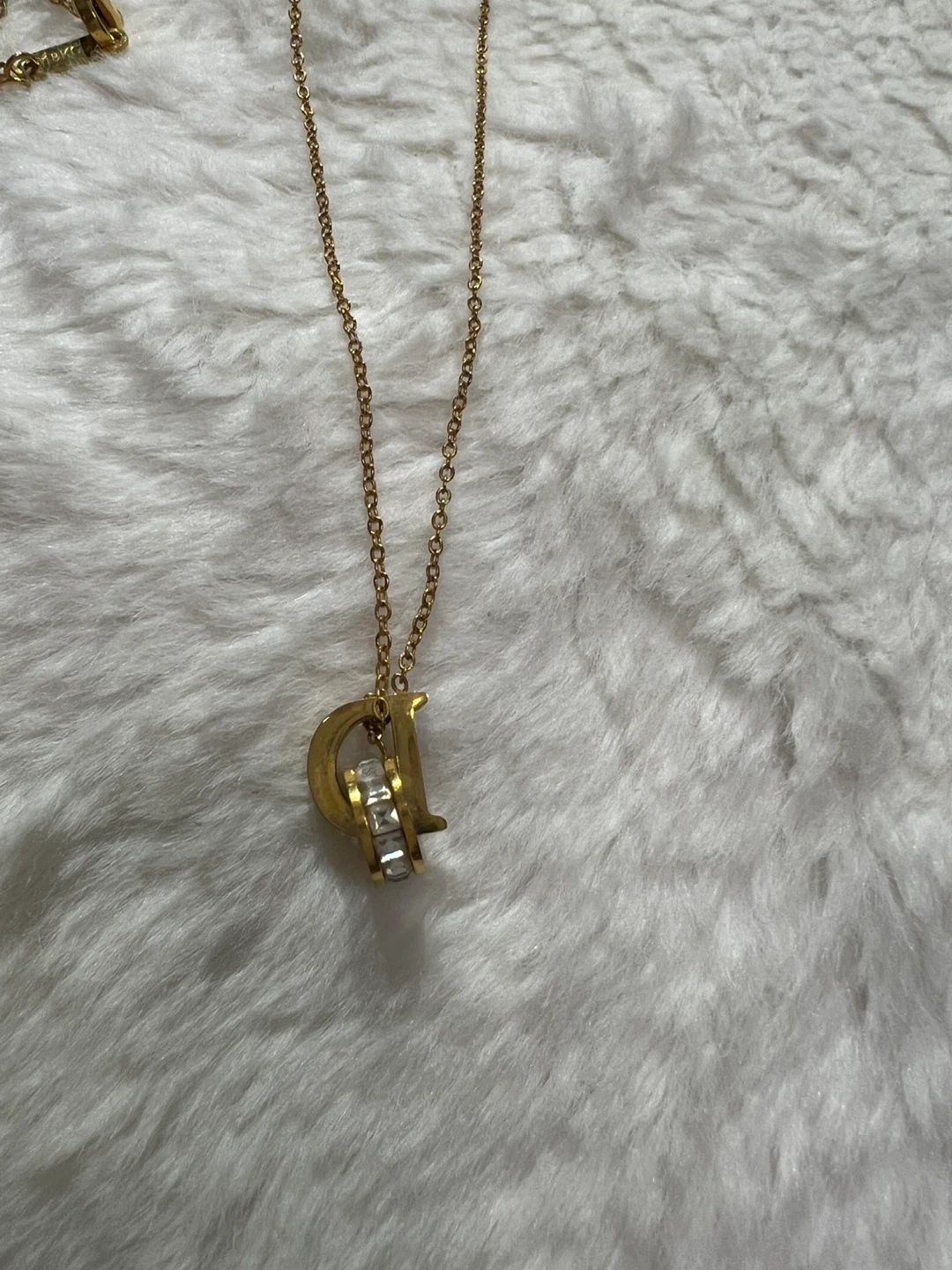 Selling a beautiful necklace in gold tone! It has a distinctive 'D' pendant with clear stones. The chain is adjustable for a perfect fit. It's in excellent condition and ready to add a touch of elegance to your style