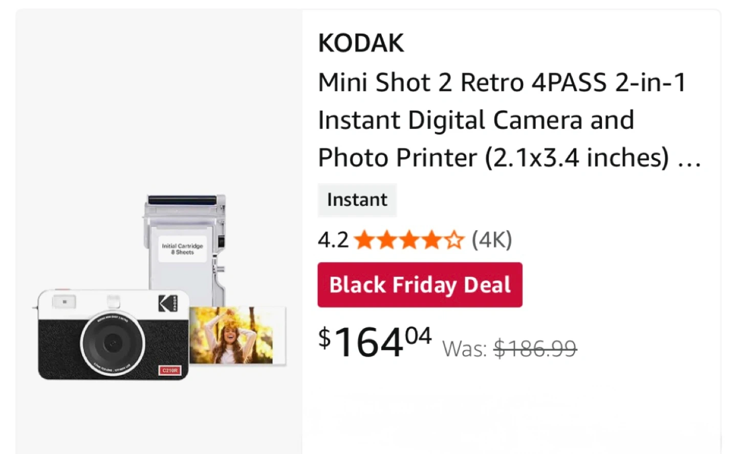 Selling a Kodak Mini Shot 2 Retro 4PASS 2-in-1 Instant Digital Camera and Photo Printer! BRAND NEW! It also includes a free 8 pack of photo paper inside. The camera connects to your smartphone via Bluetooth. Take and print photos instantly!