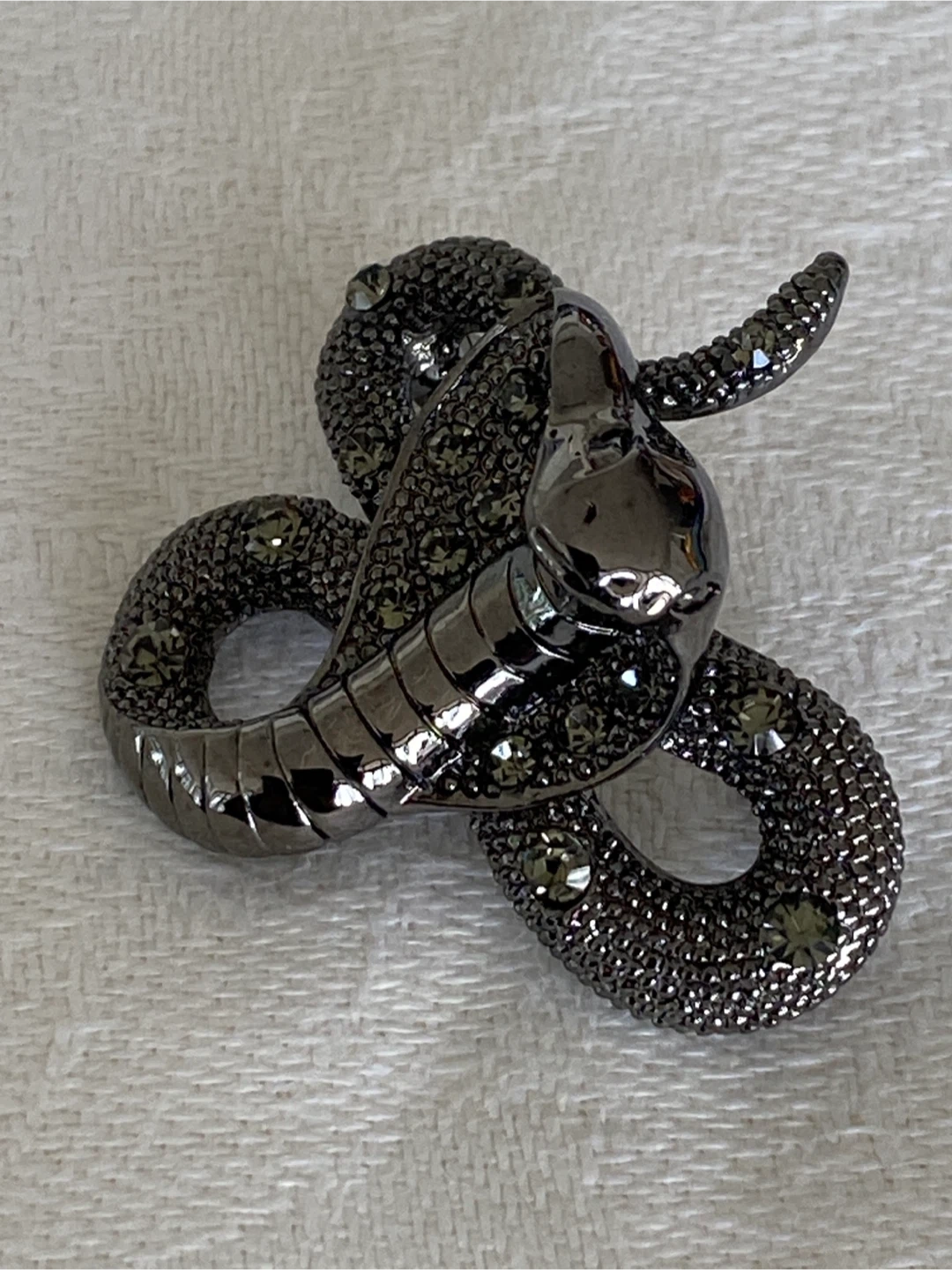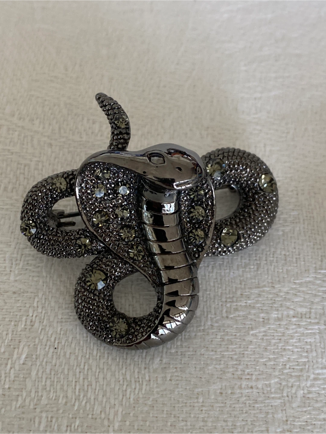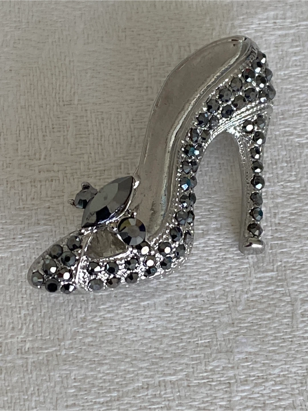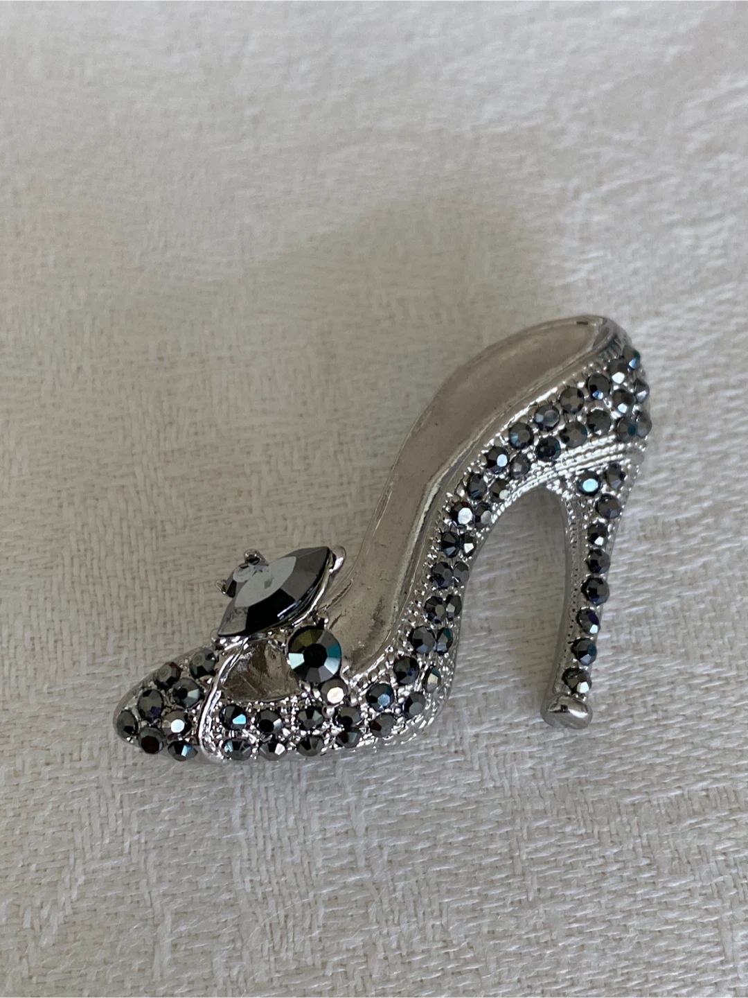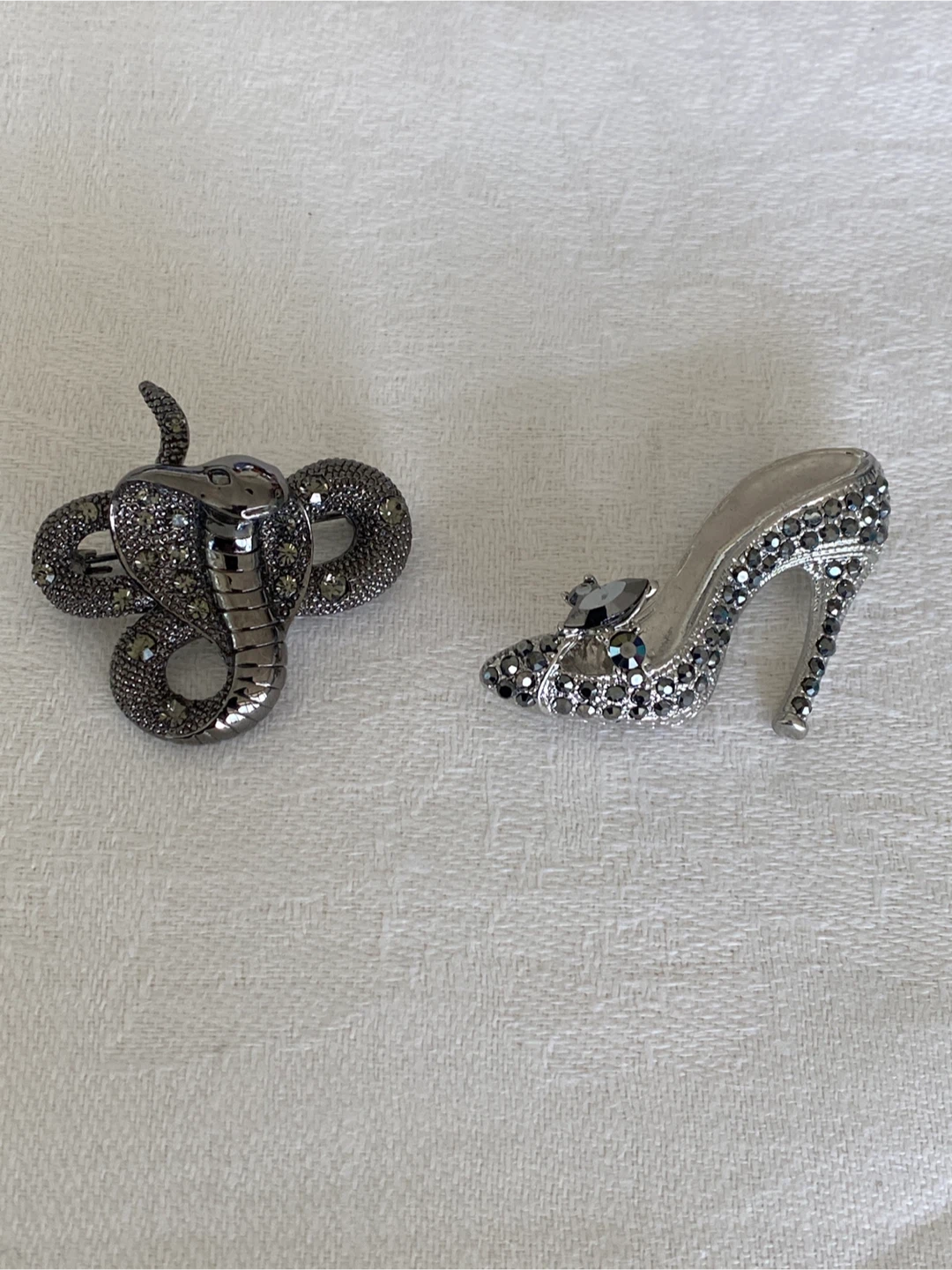 Selling two vintage brooches! One is a snake and the other is a high heel shoe. They are both silver and covered in small stones. Both are in a great condition