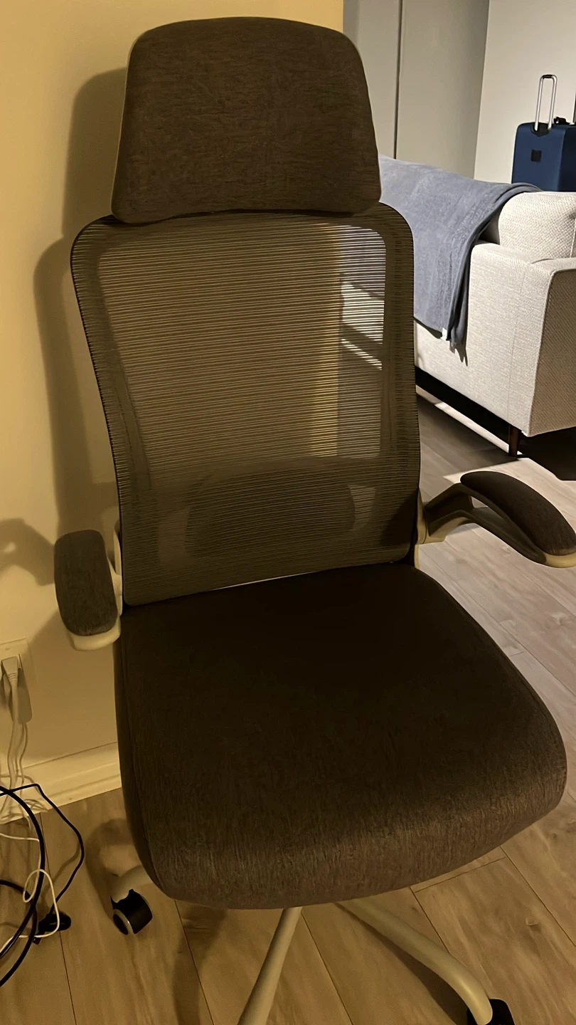 Selling an ergonomic office chair designed with contoured lumbar support. It's supportive and adjustable for maximum comfort. The chair has a 300 lb weight capacity and comes with all tools included for easy assembly. It's in great condition and ready to help you work comfortably!