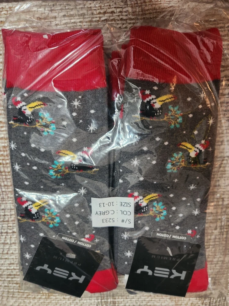 Selling a pair of brand new KEY men's socks, still in the original packaging! The socks are grey with a fun pattern and red accents. They are size 10-13 and made of cotton.