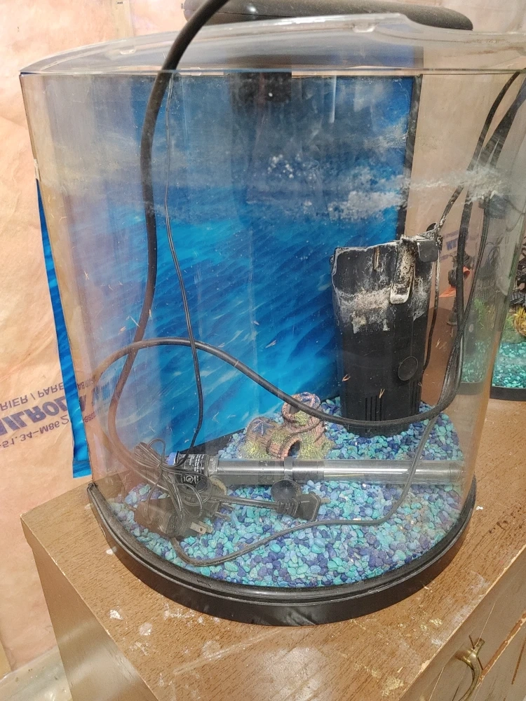 Selling a used 10 gallon fish tank that comes with the accessories you see inside. It includes a filter, heater, decorative rock, and gravel. Perfect for someone looking to start a small aquarium!