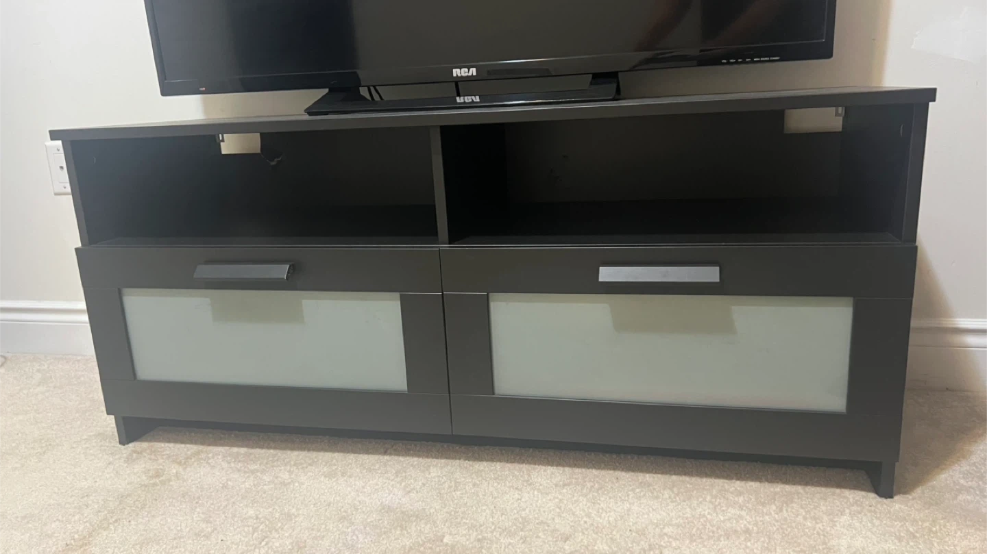 Selling a black TV stand with drawers. It's in great shape and ready for a new home! The drawers provide extra storage, and it fits nicely in any living room setup and 55”RCA TV