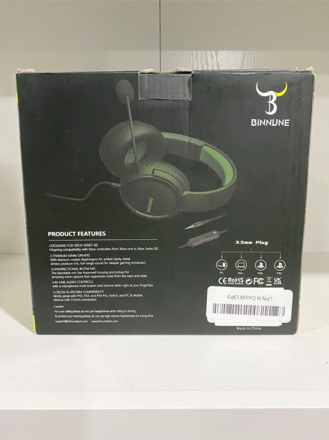 Selling a Binnune BG02 gaming headset! It's compatible with Xbox Series X|S, Xbox One, PS5, PS4, PC, and mobile devices. It features a 3.5mm plug, noise reduction mic, and a volume controller. The headset also has 50mm drivers for clear audio, and a unidirectional boom mic for suppressing noise. Comes in the original box!