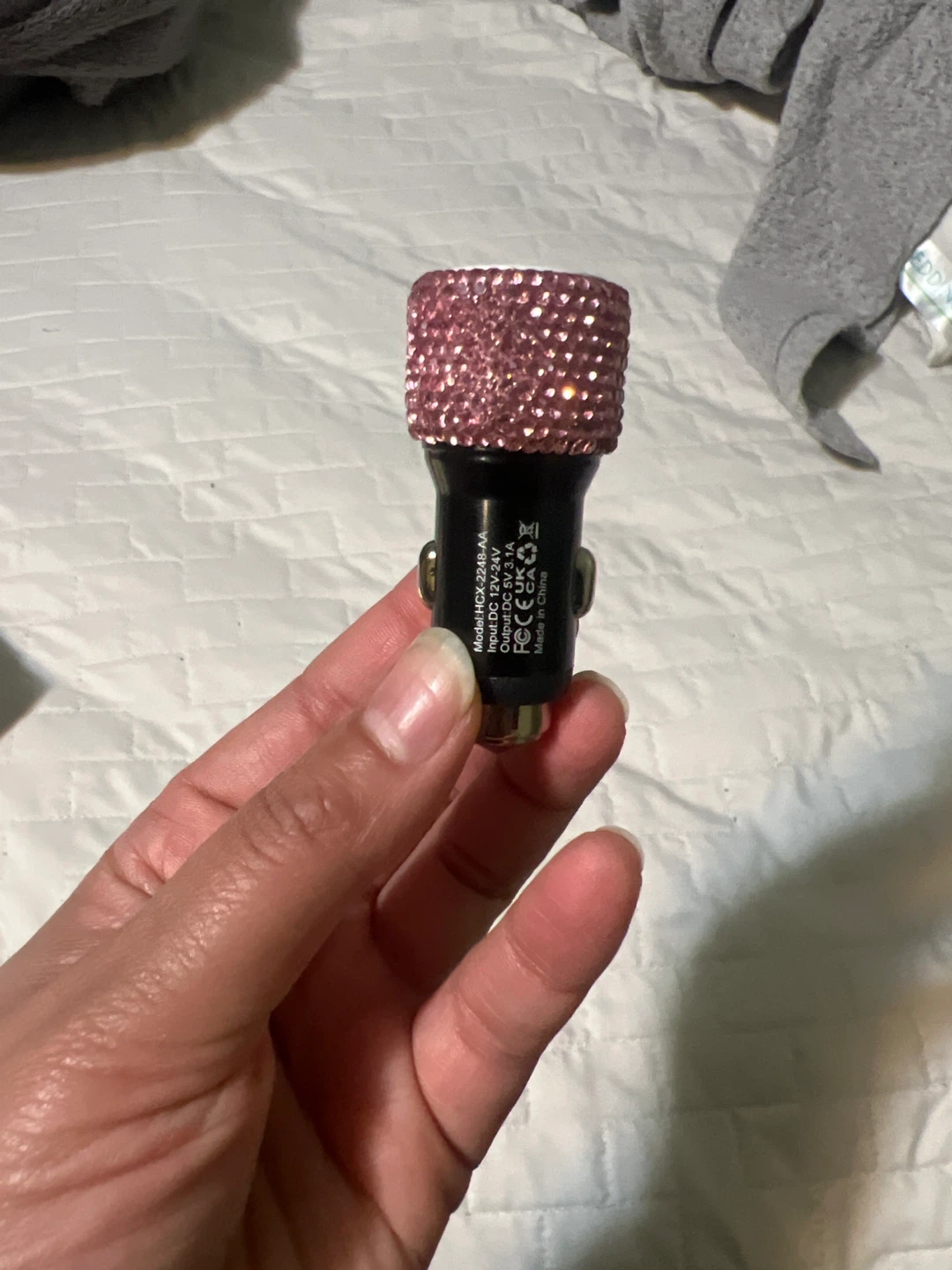 Selling a cute car charger! It's black with a pink rhinestone design. It has two USB ports: 1A and 2.4A