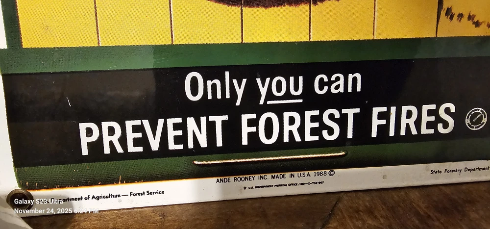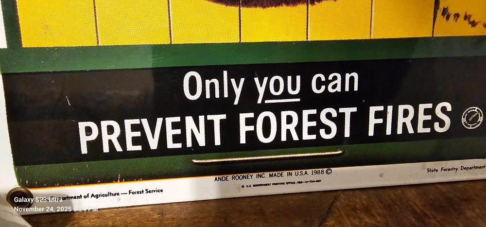 Selling a Smokey Bear sign that reads "Only you can PREVENT FOREST FIRES". It's a U.S. Department of Agriculture - Forest Service item. Made in USA in 1988 by ANDE ROONEY INC.