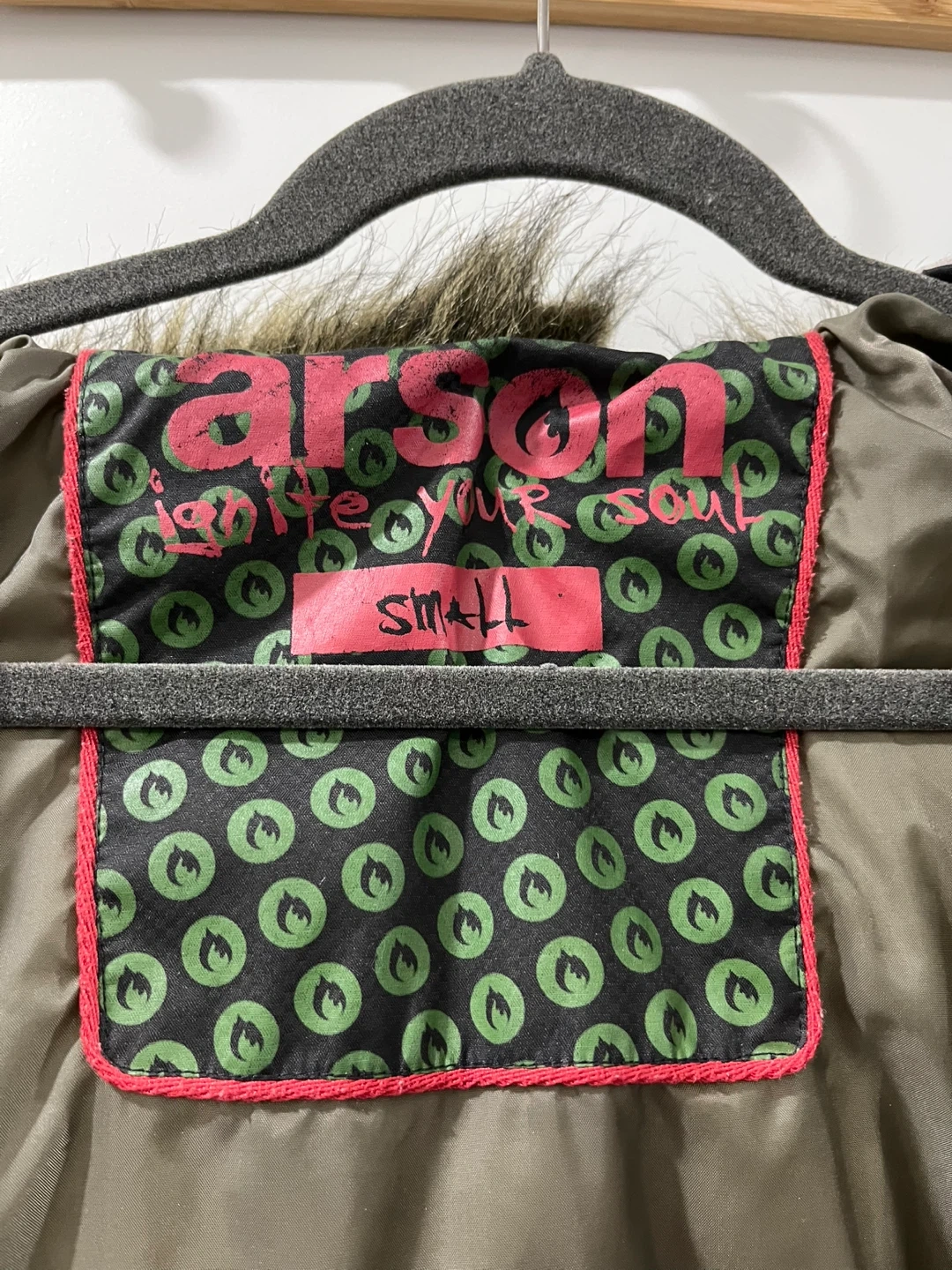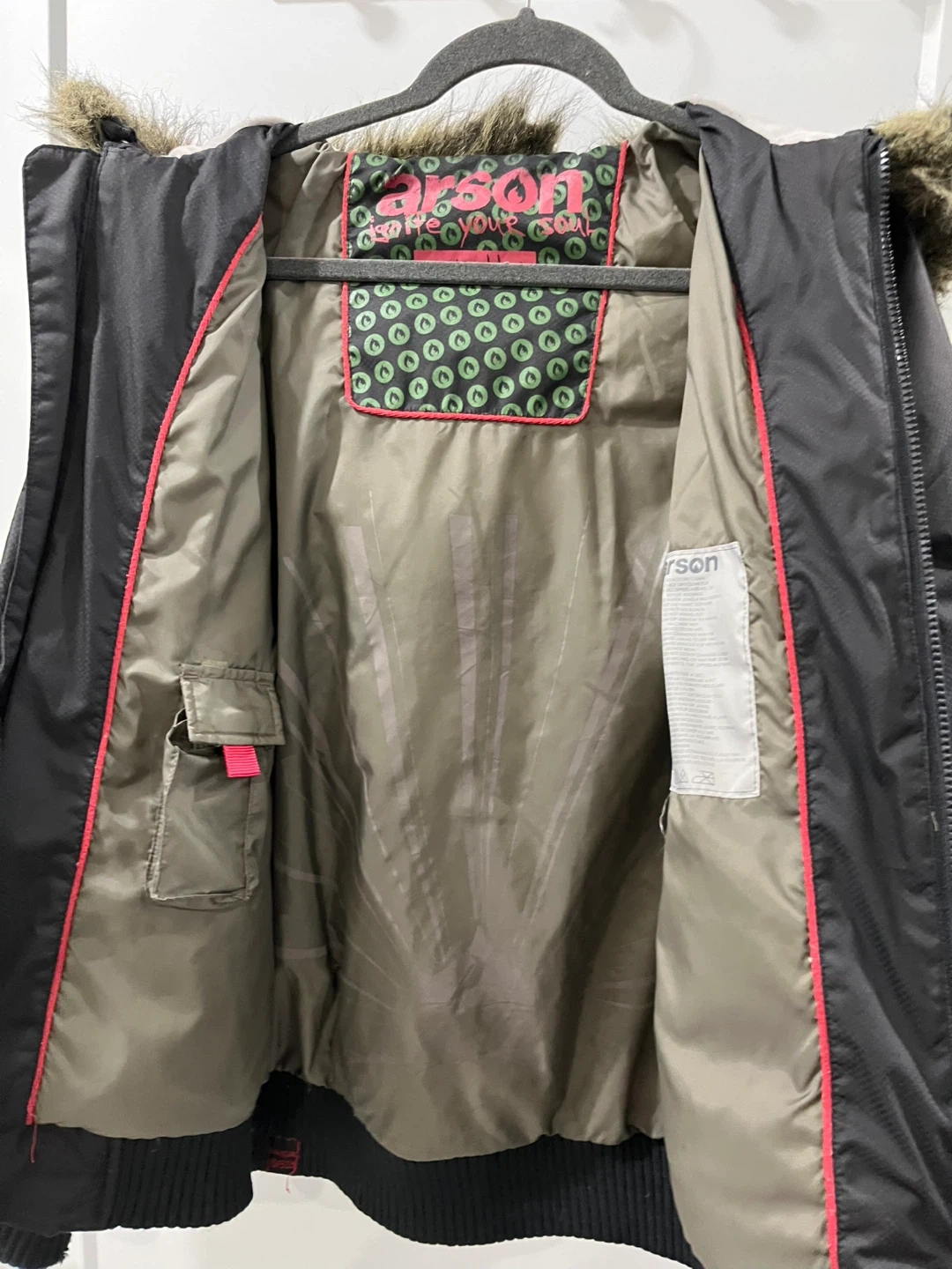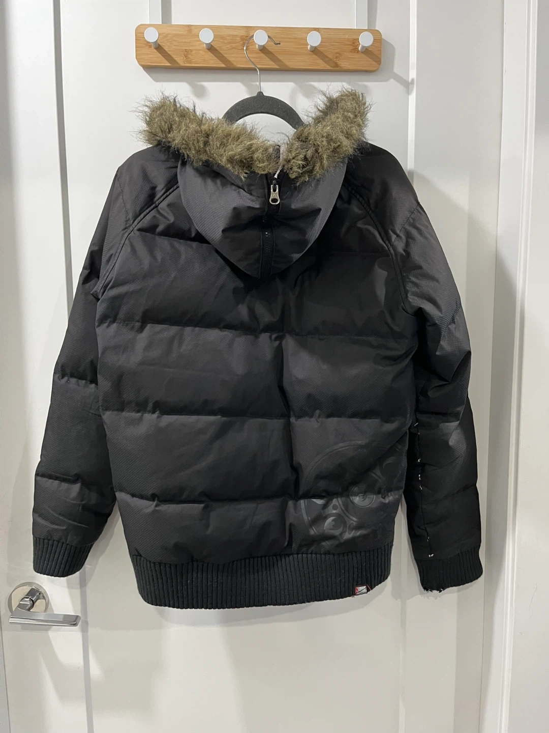 Cozy Arson winter puffer men’s jacket with a faux fur-trimmed hood! It's a size small and perfect for keeping warm on chilly days. The jacket is black with a unique patterned lining. Great for staying stylish and snug!