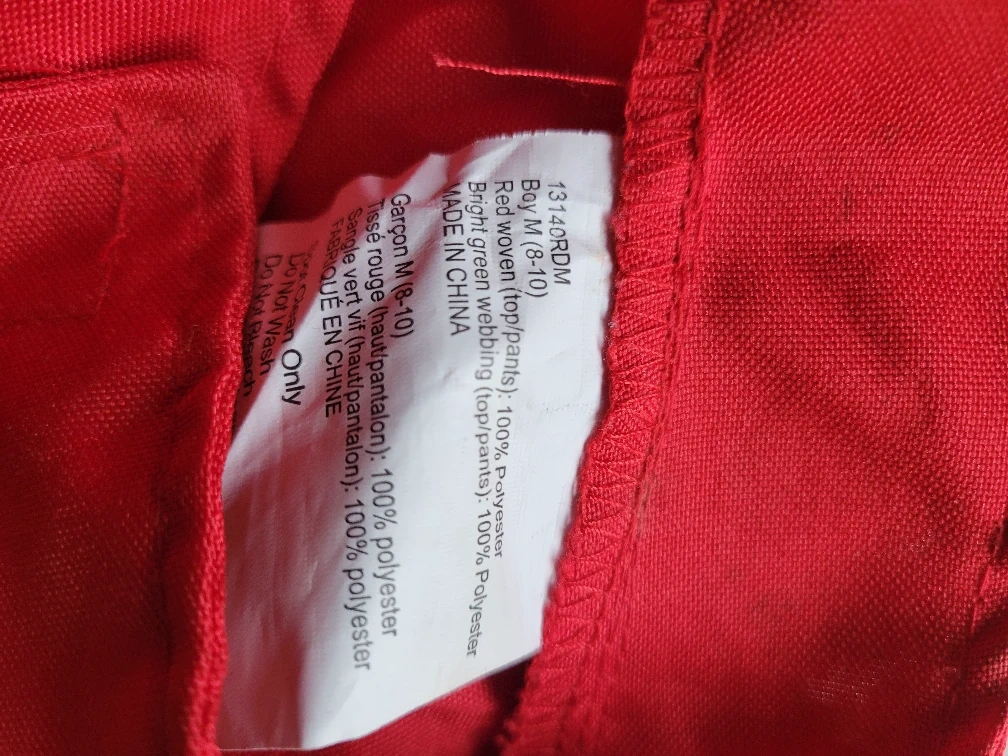 Fire Fighter costume. size M (8-10). It's red and made of 100% polyester. Perfect for dress-up or Halloween!