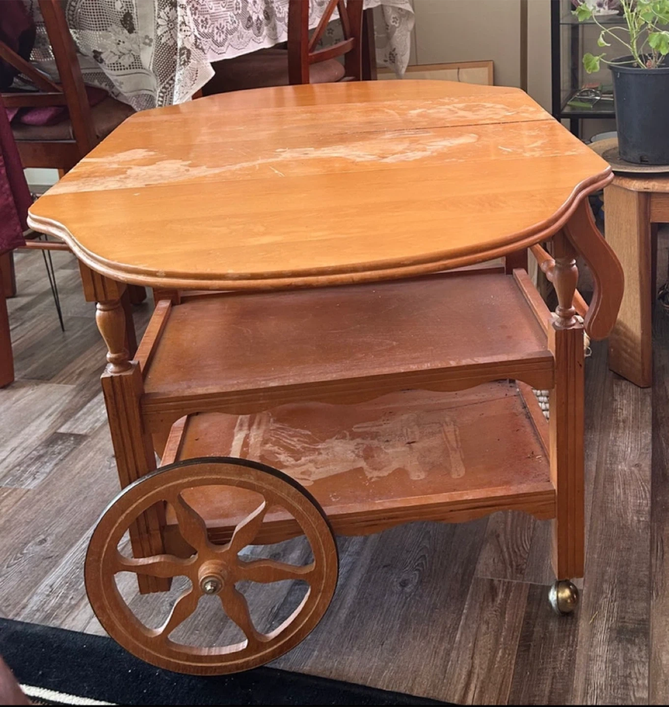 Selling a vintage wooden tea cart with wheels. It has a drop-leaf top and two shelves for storage. Perfect for serving tea or using as a side table. It shows some signs of wear, but it's still a charming piece.