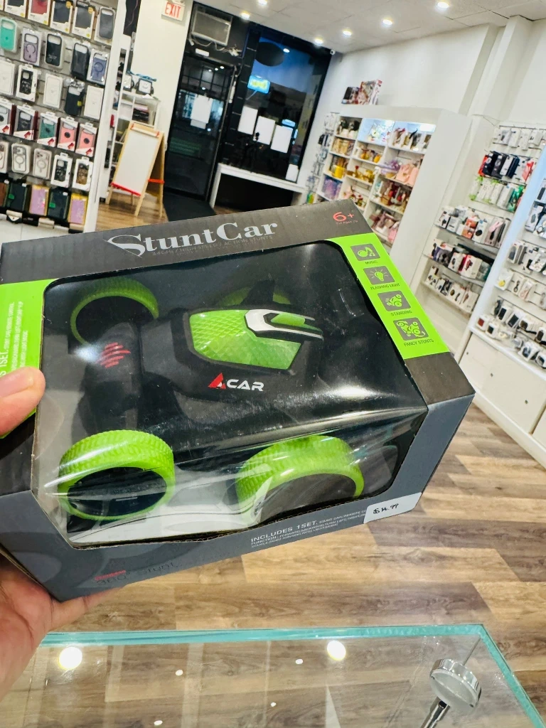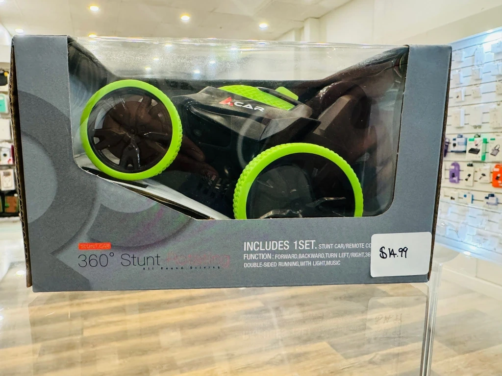 Selling a brand new Stunt Car, still in its original packaging! It features 360° all-round driving and includes 1 set. The car has forward and backward movement, can turn left and right, and features double-sided running with light and music. Originally priced at $14.99.