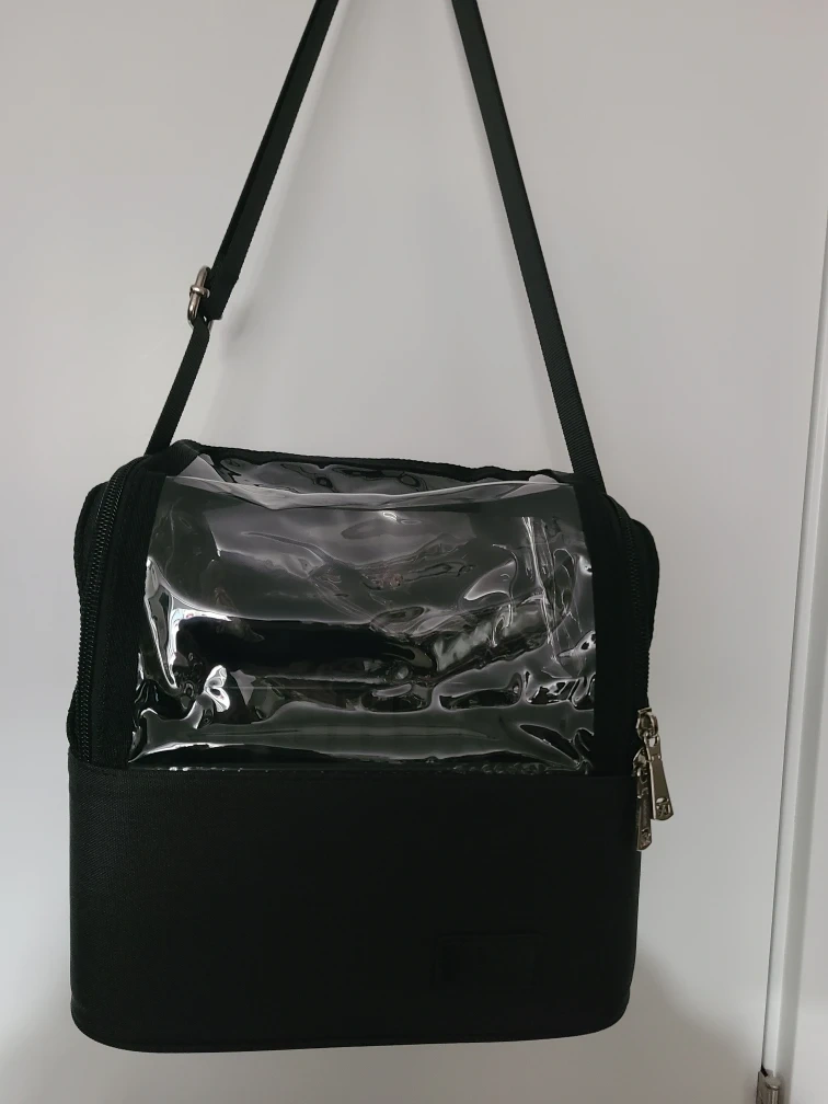 Selling a black makeup/cosmetic bag. Great for storing makeup brushes or makeup. Keeps it dust free! It has a clear top and a shoulder strap. Great for organizing your beauty products!
