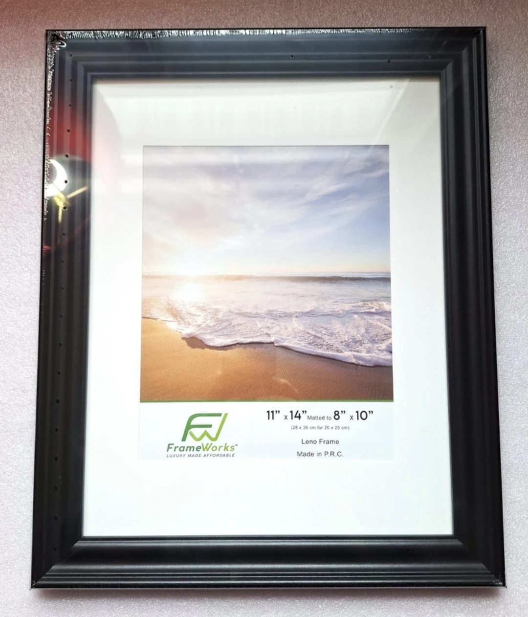 BRAND NEW still SEALED Lot of 2 FrameWorks 11" x 14" Matted to 8" x 10" Black Wood Picture Frames with Luxury Wide Molded Edge, Removable Mat and Tempered Glass. Sells on AMAZON for $56.87 plus tax. Selling for $35 for the pair.
