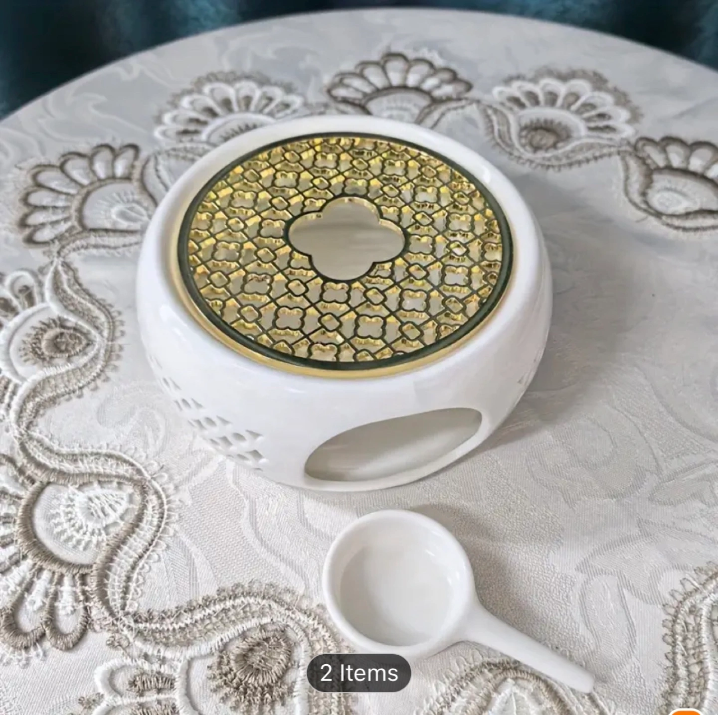 This charming tea warmer comes with a matching spoon! It's made of ceramic and zinc alloy. The outer diameter is 15cm (5.91in) and it stands 6cm (2.36in) tall. Perfect for keeping your tea warm and cozy!