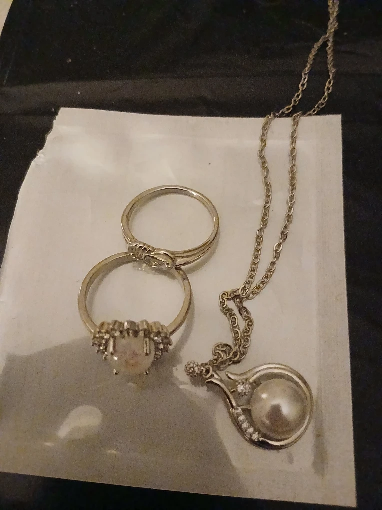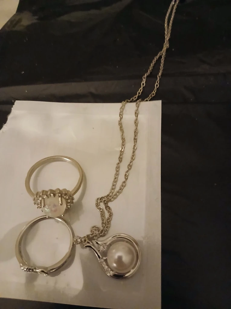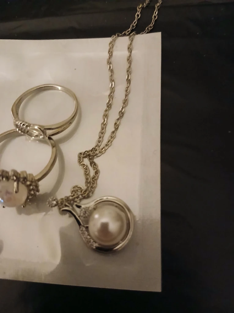Selling a lovely pearl necklace and ring set. The necklace features a pearl pendant with small decorative stones. The ring is also adorned with a pearl and similar stones. They're in good condition! Plus another silver tone stacking heart ring