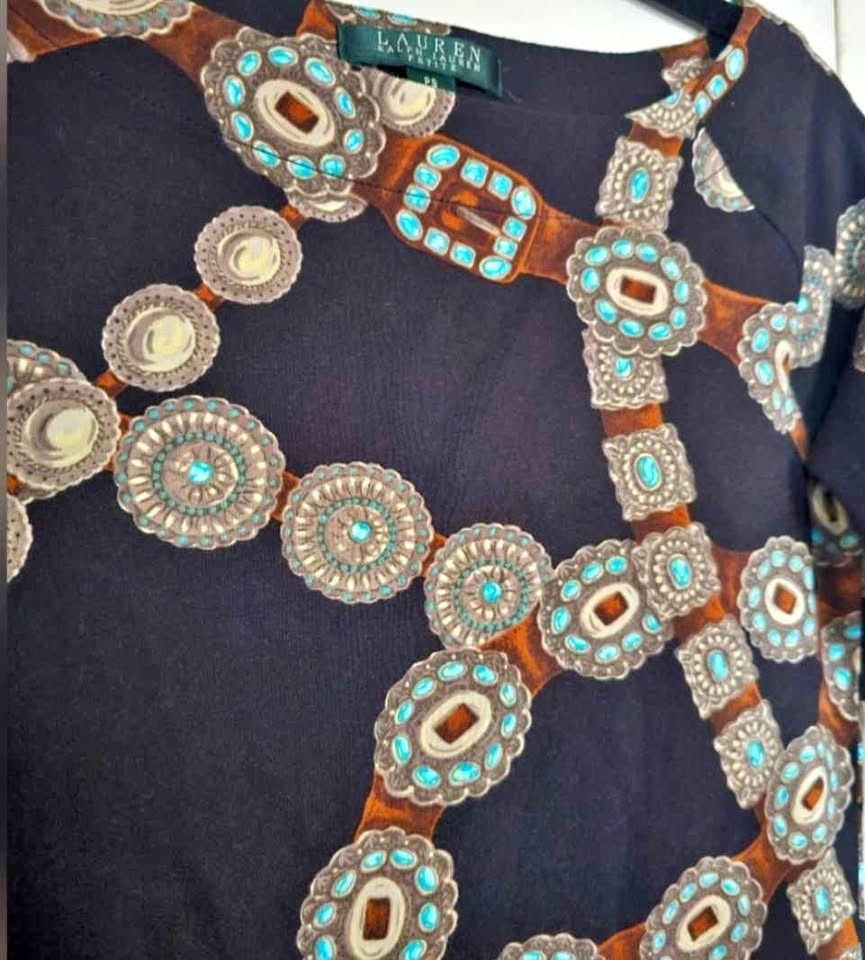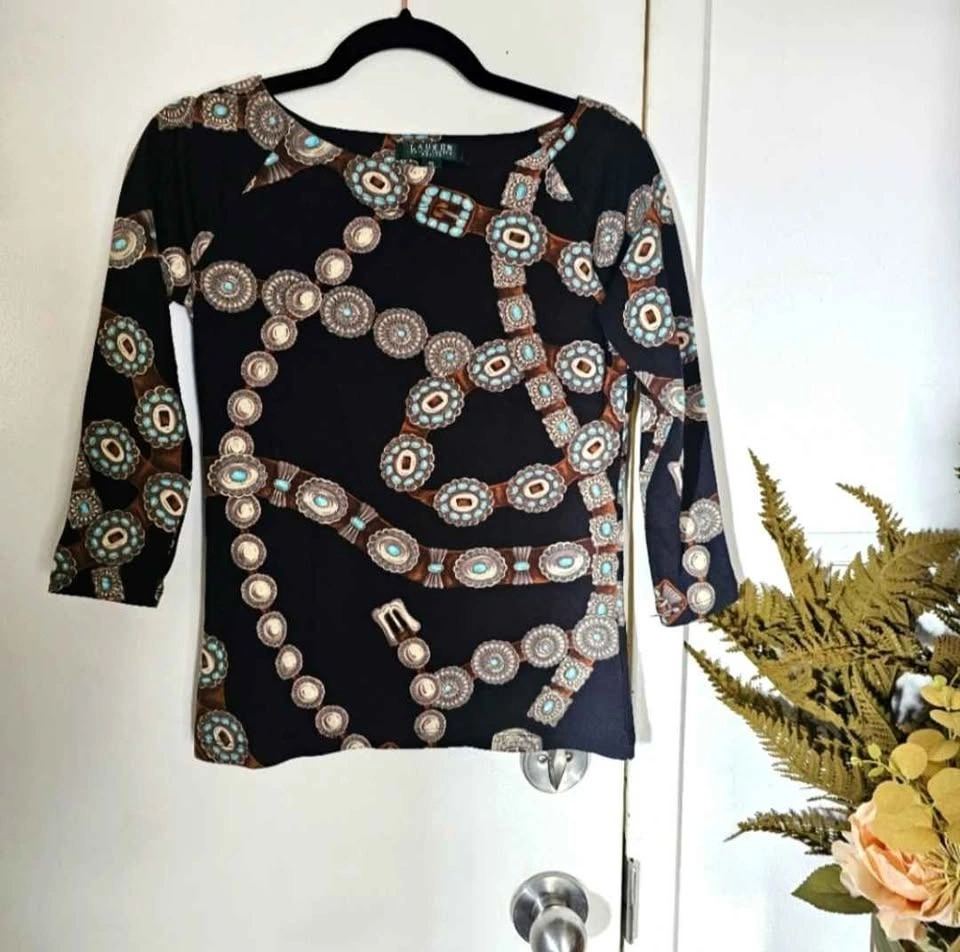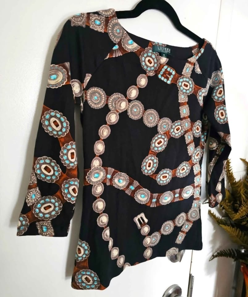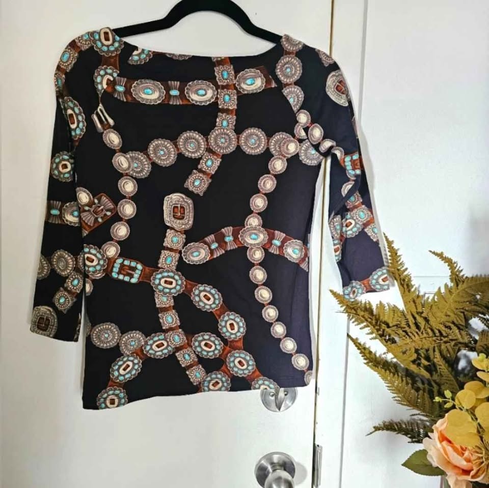Unique vintage top from Lauren Ralph Lauren, with an all-over trompe d'oeil style southwestern concho belt print! Top has a boatneck cut and 3/4 sleeves, and is made from a soft and stretchy blend of cotton and elastane. The style is quite fitted and looks amazing with a high waist maxi skirt or jeans.