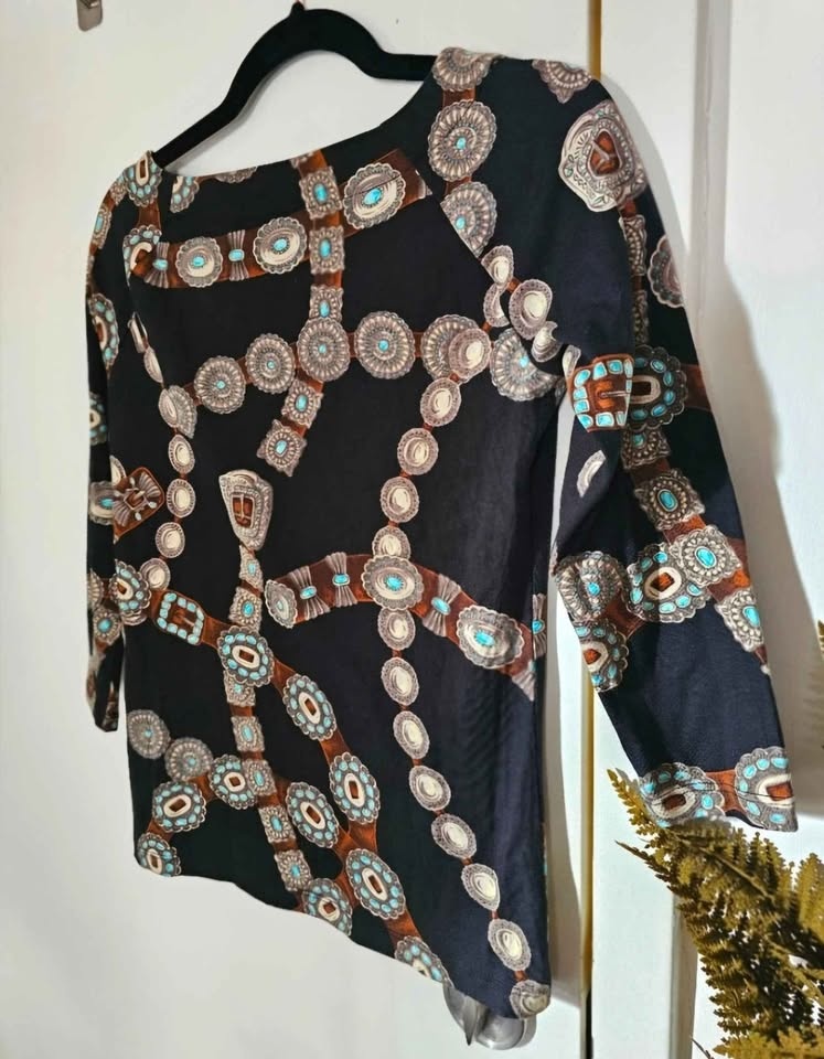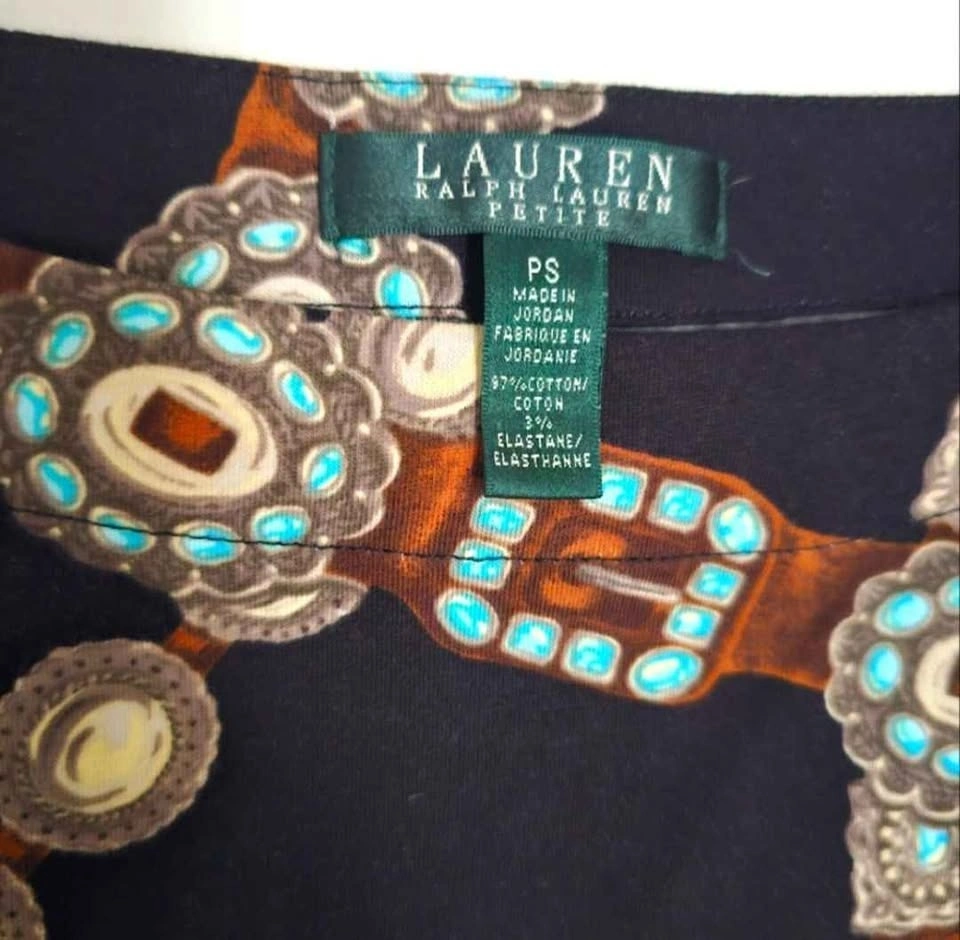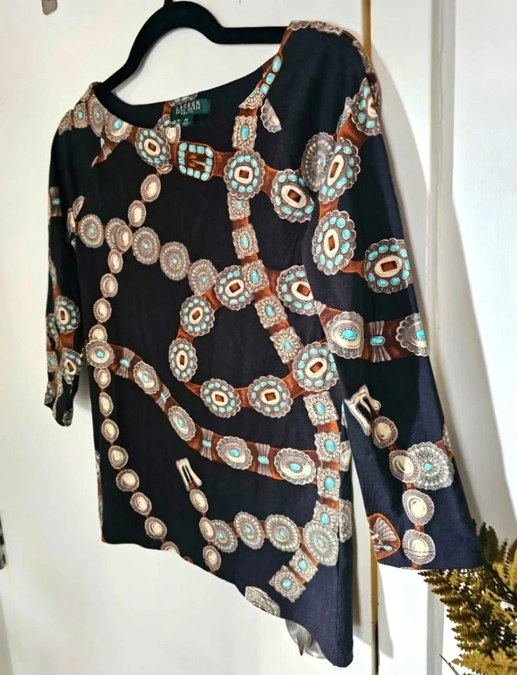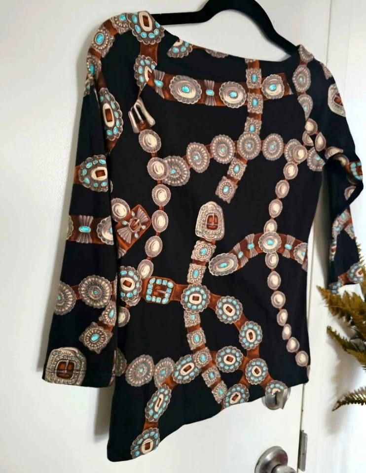 Unique vintage top from Lauren Ralph Lauren, with an all-over trompe d'oeil style southwestern concho belt print! Top has a boatneck cut and 3/4 sleeves, and is made from a soft and stretchy blend of cotton and elastane. The style is quite fitted and looks amazing with a high waist maxi skirt or jeans.