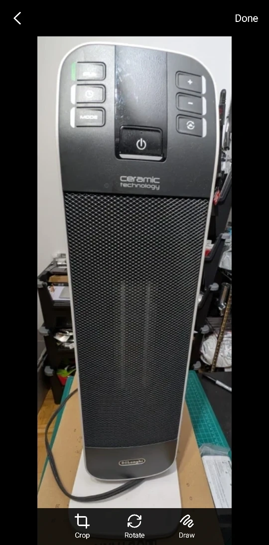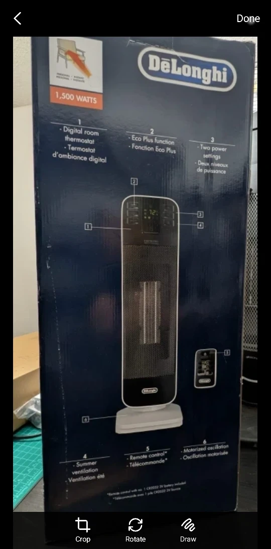 Selling a brand new DeLonghi Ceramic Technology tower heater, model HFX65V15CA. It's a 120V, 1500W heater. The box shows it has a digital room thermostat, Eco Plus function, and two power settings. It also features summer ventilation, remote control, and motorized oscillation. Comes with the remote!