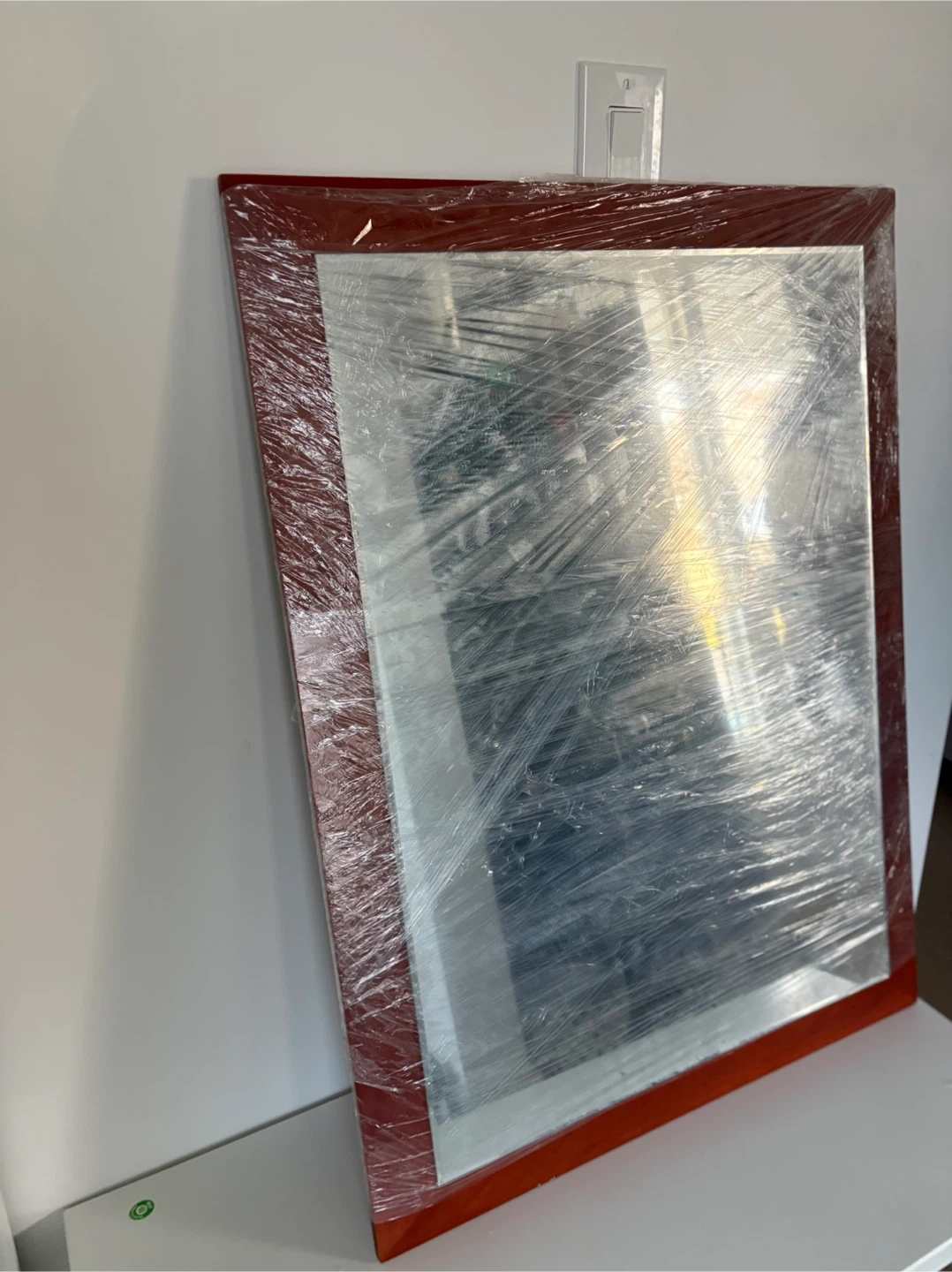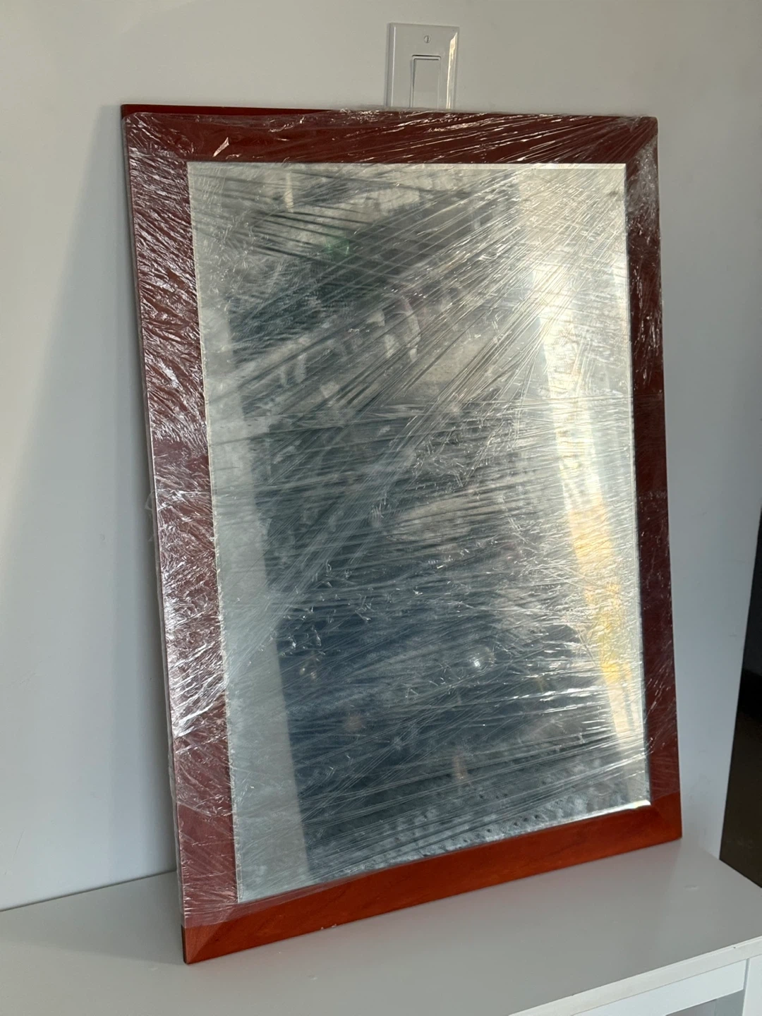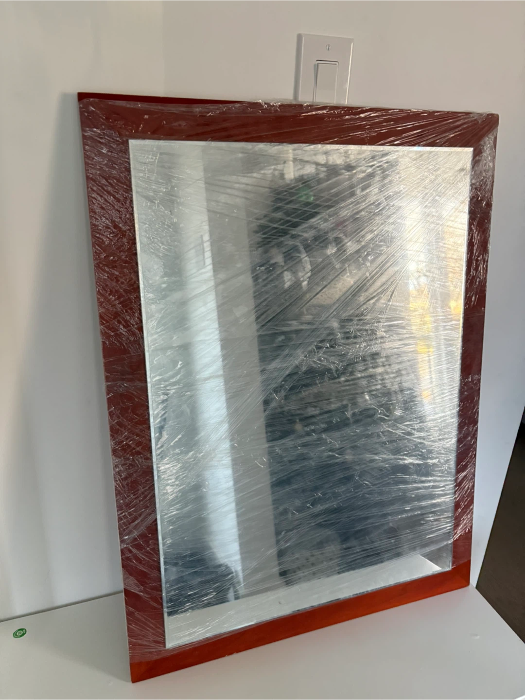 Selling a framed mirror with a reddish-brown frame. It's still wrapped in plastic for protection. Perfect for adding a touch of warmth to any room!