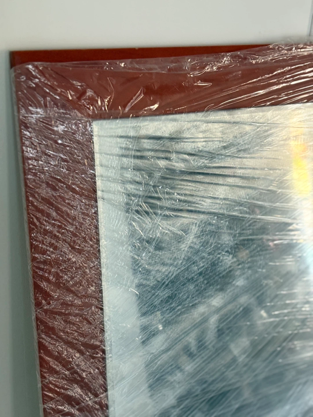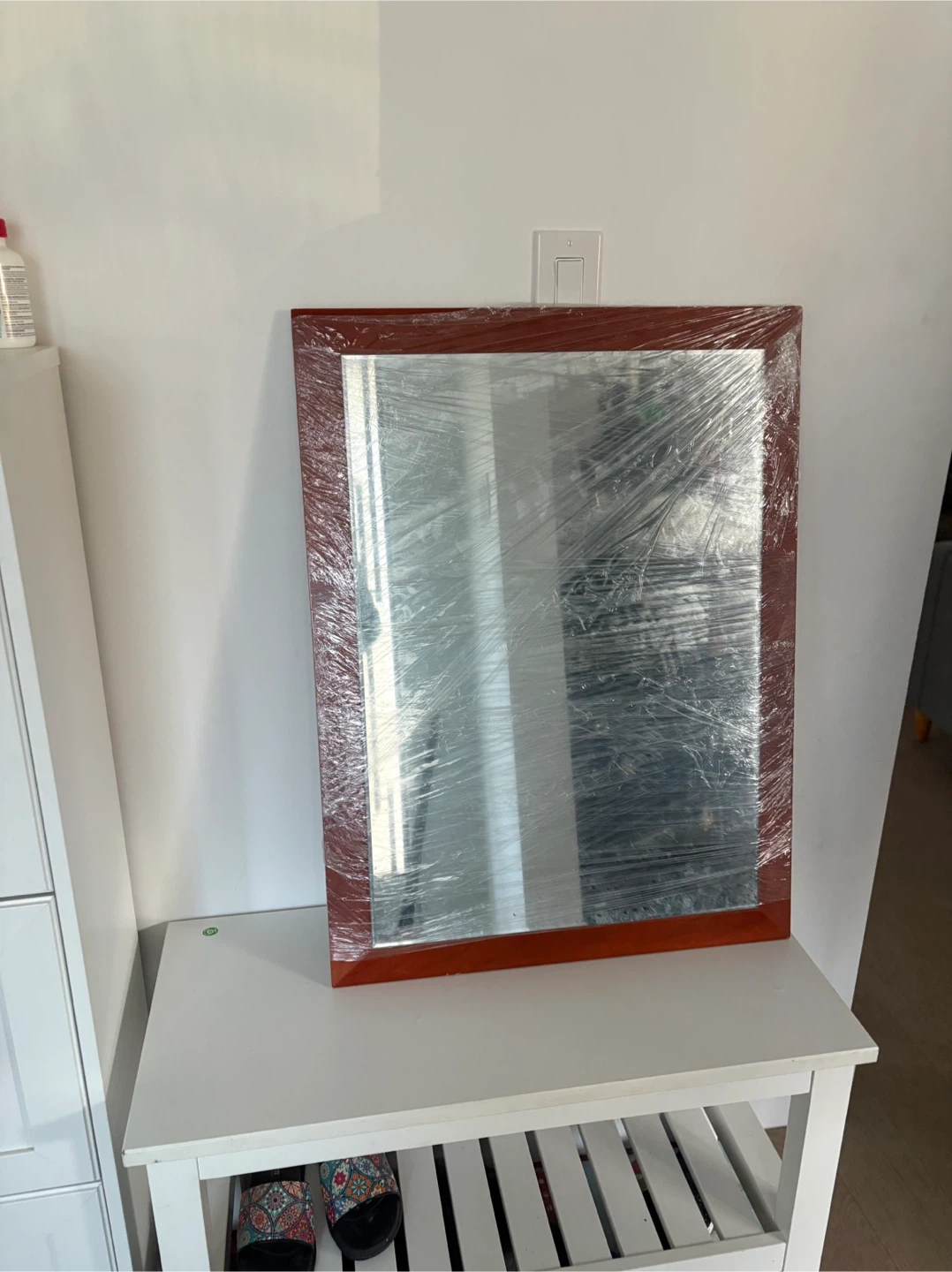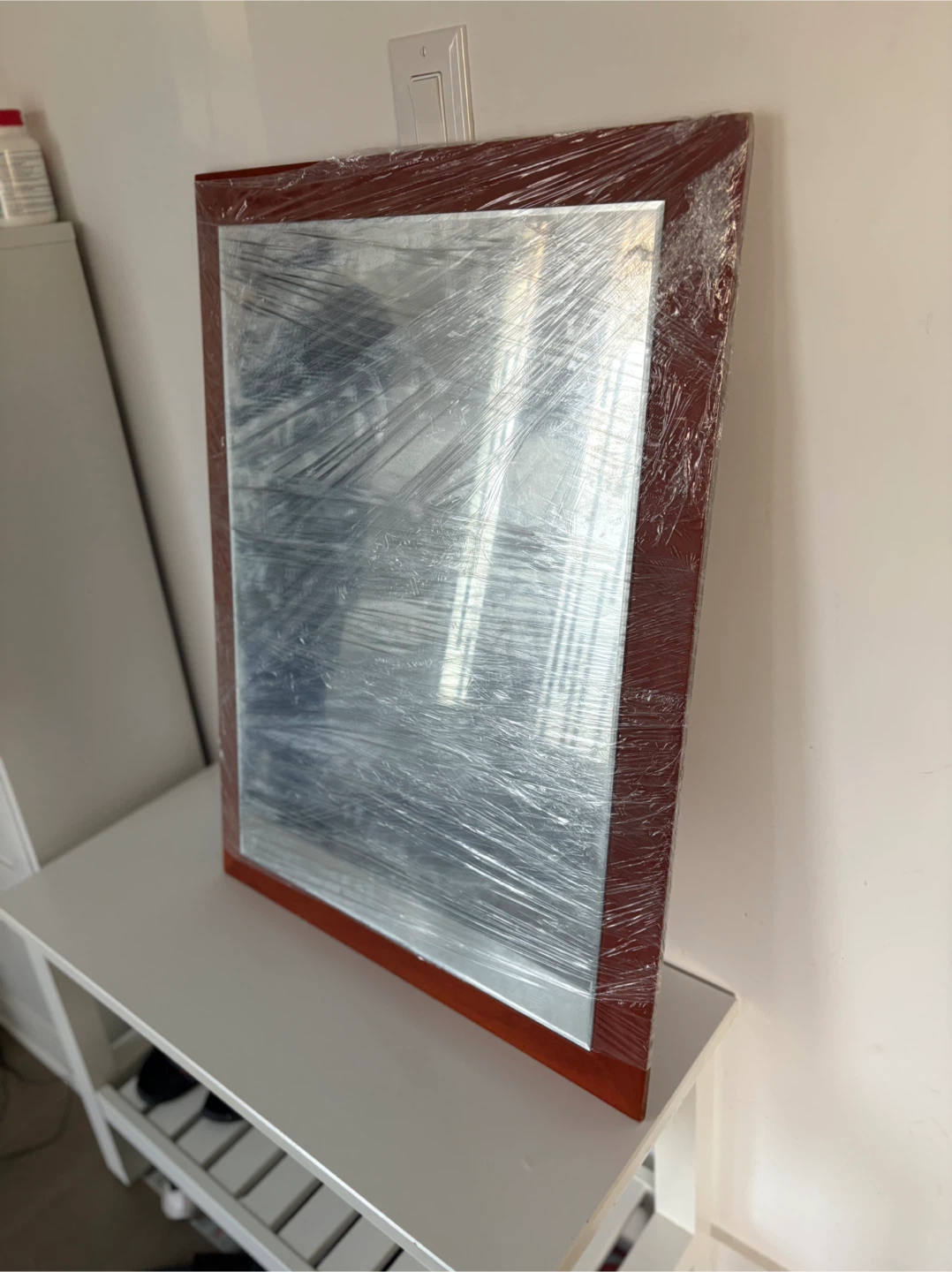Selling a framed mirror with a reddish-brown frame. It's still wrapped in plastic for protection. Perfect for adding a touch of warmth to any room!
