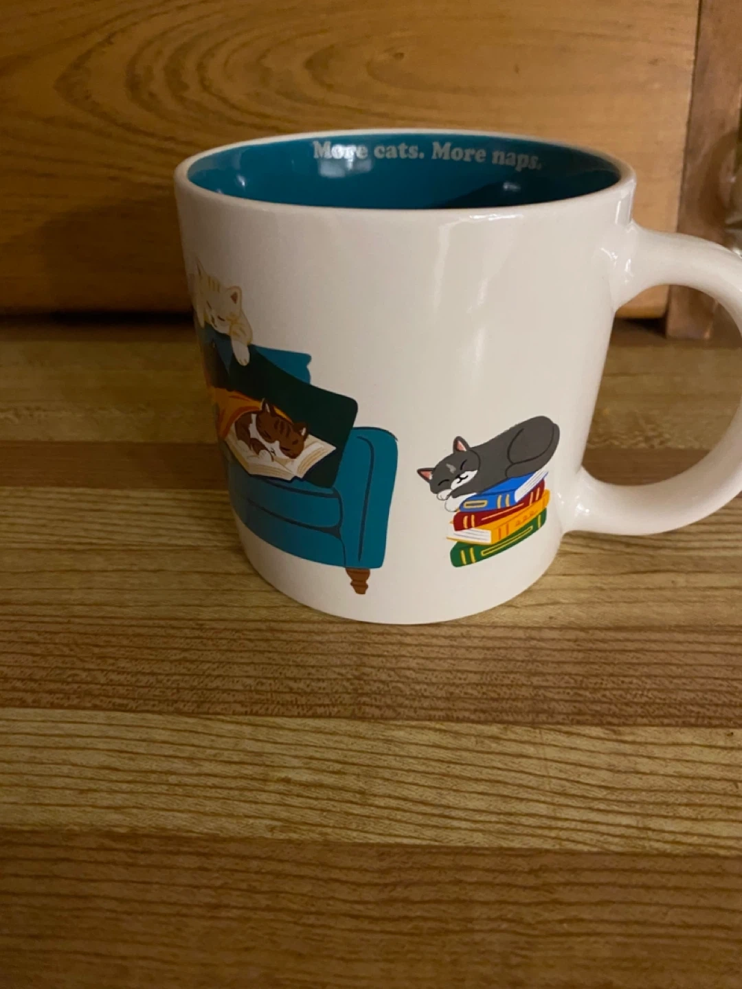 Super cute Indigo mug featuring cats napping on a couch and stacked on books! It's dishwasher and microwave safe. The sticker on the bottom says it's a 'Cat Couch Chaleur Canapé Ivory/Ivoire'. Originally bought for $12