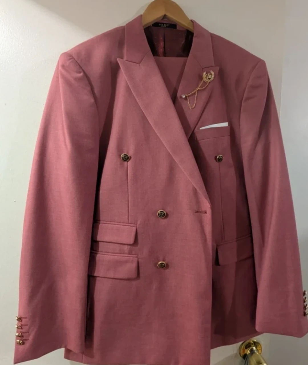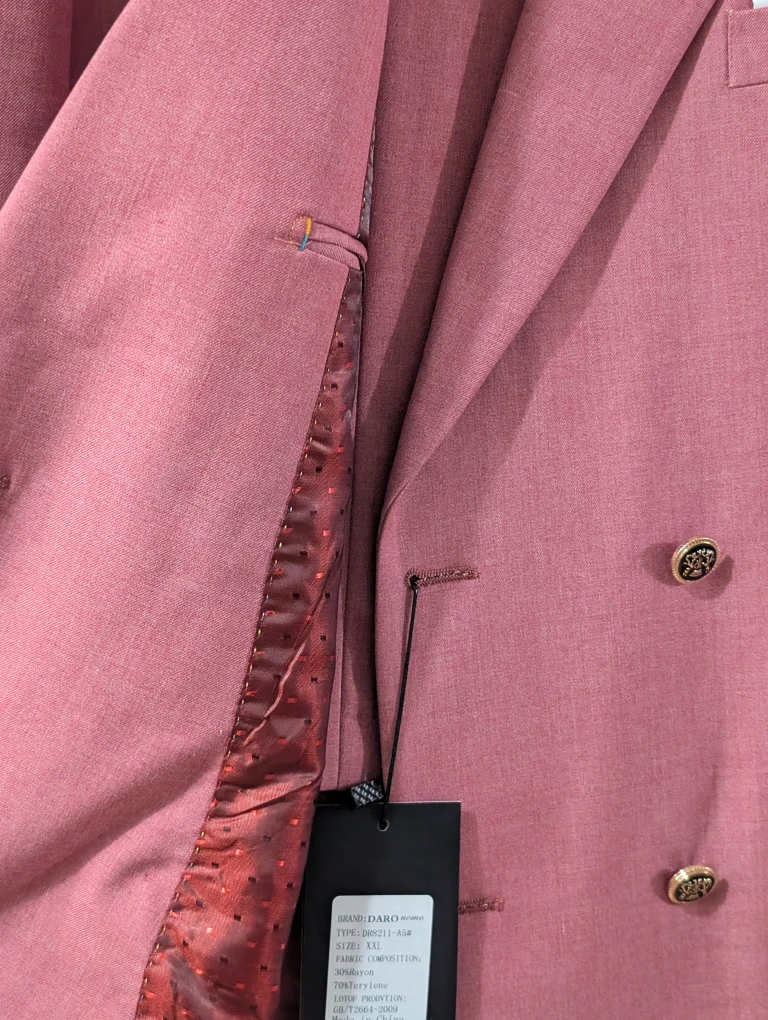 Selling a new Daro Uomo suit in size XXL! The suit is a stylish pink colour and is made of 30% rayon and 70% terylene.