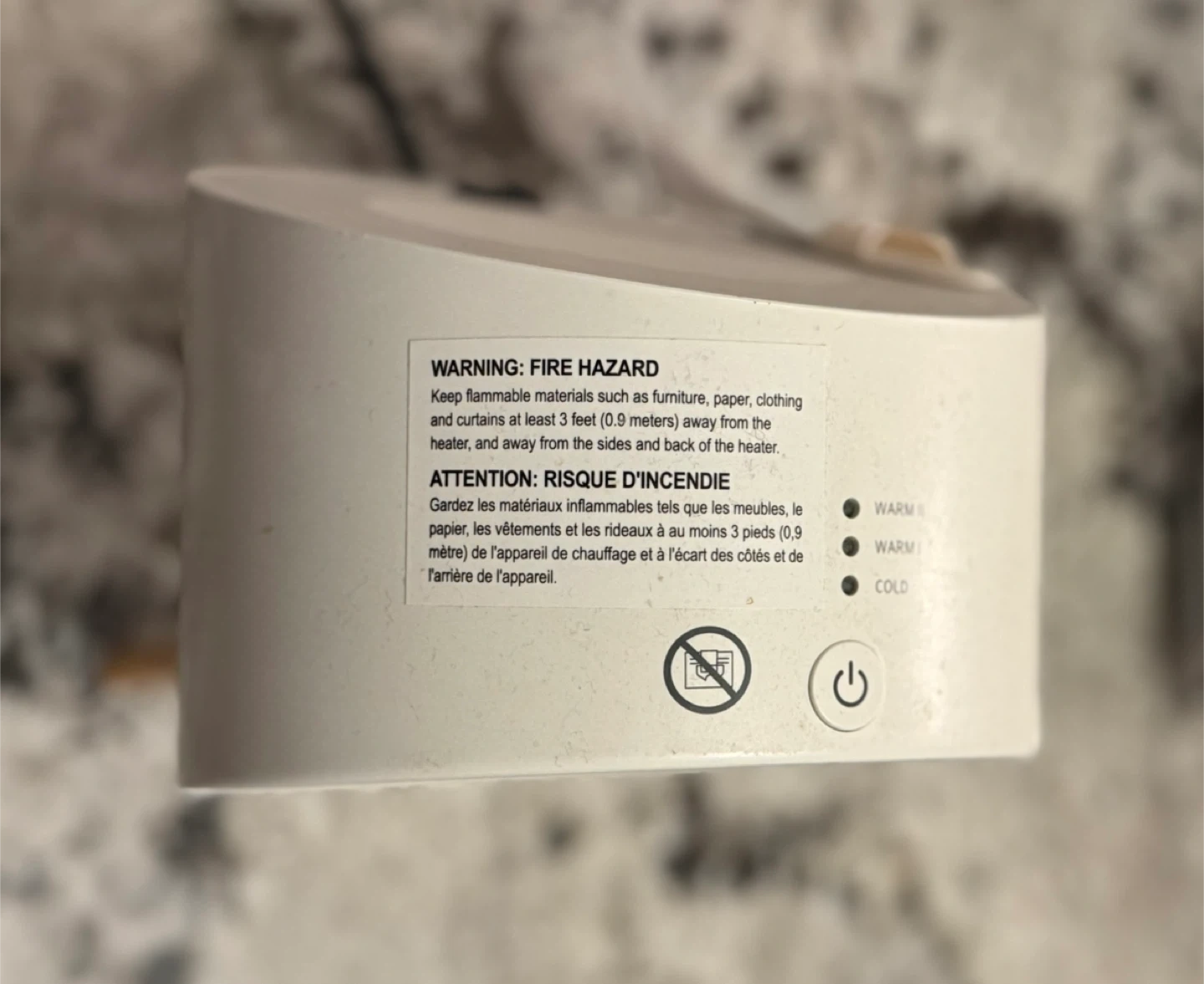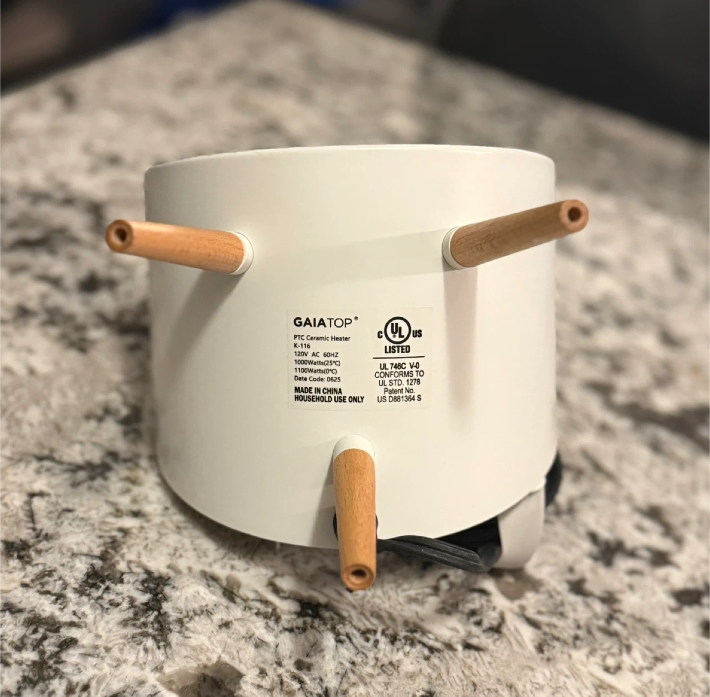 Cute tripod-leg mini heater, white with wood legs. Works well for small rooms or a desk. Has 3 modes (Warm I, Warm II, Cool Fan). Power switch on the back. Good used condition. No box.