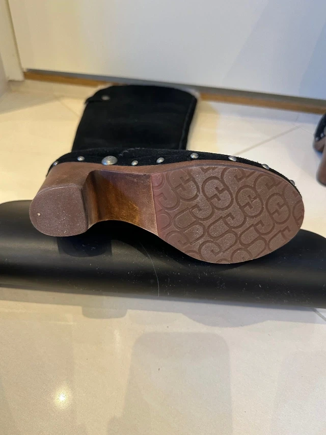 Selling a pair of UGG tall boots! They are black suede leather with a wooden heel. They're in great condition and super stylish for the fall and winter