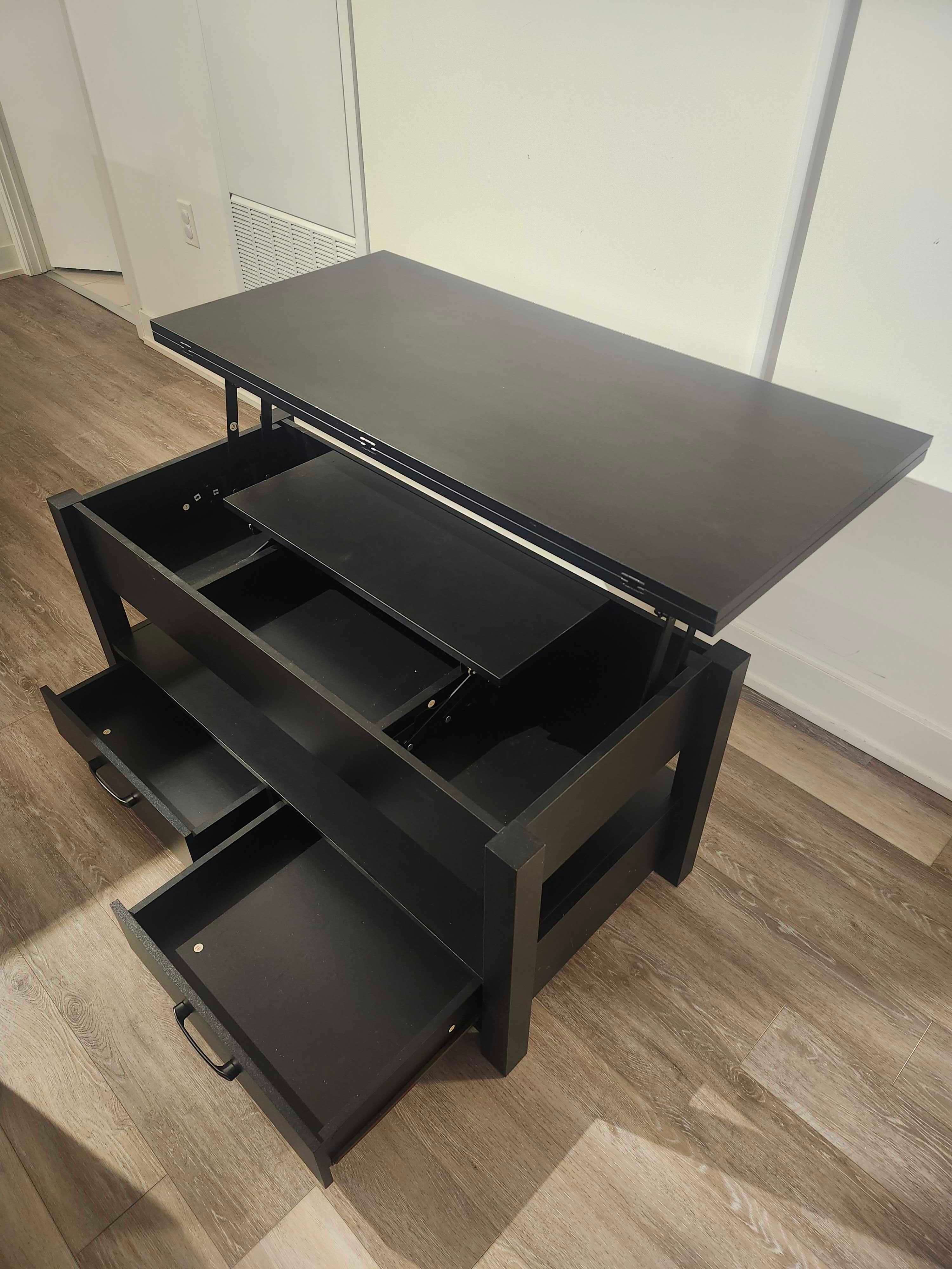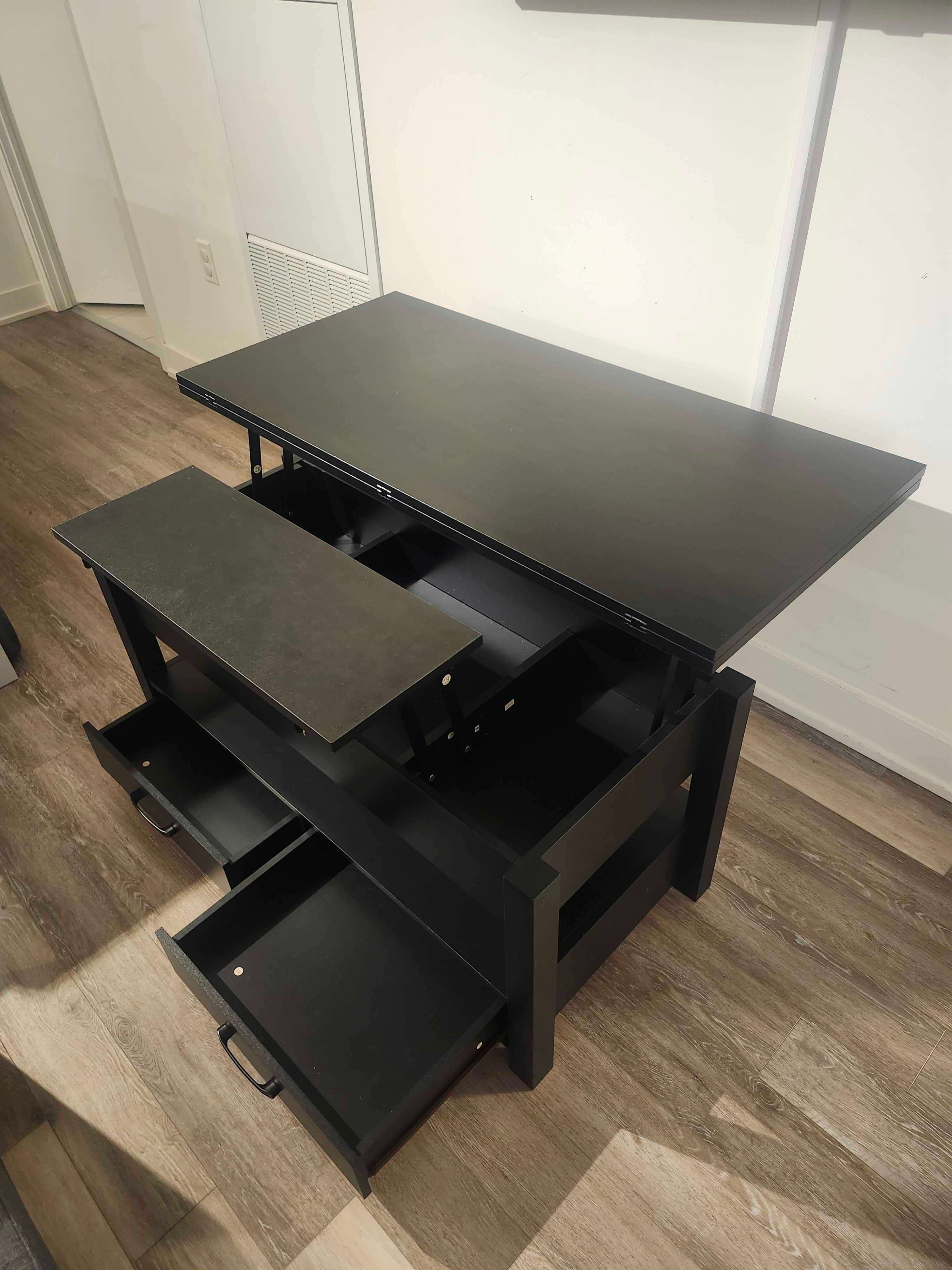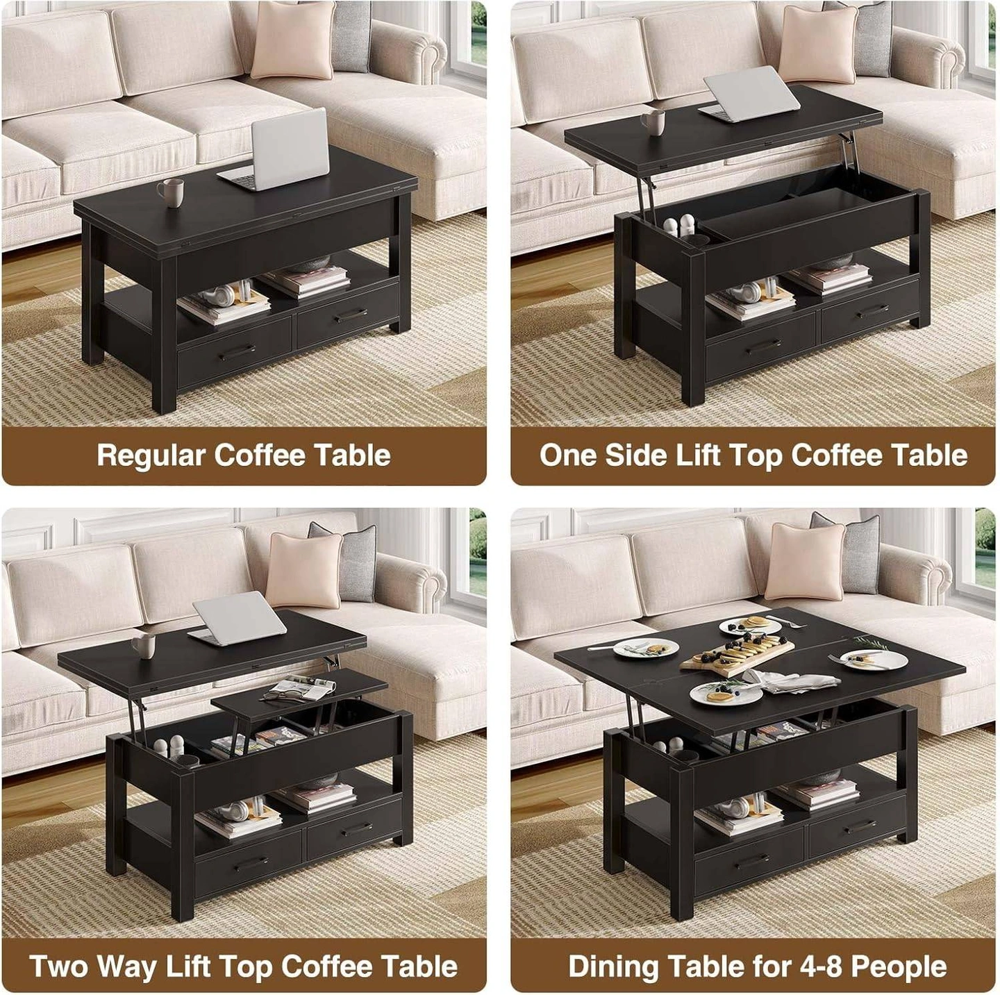 This black lift-top coffee table is perfect for small spaces! It can be used as a regular coffee table, a one-side lift-top coffee table, a two-way lift-top coffee table, or even a dining table for 4-8 people.