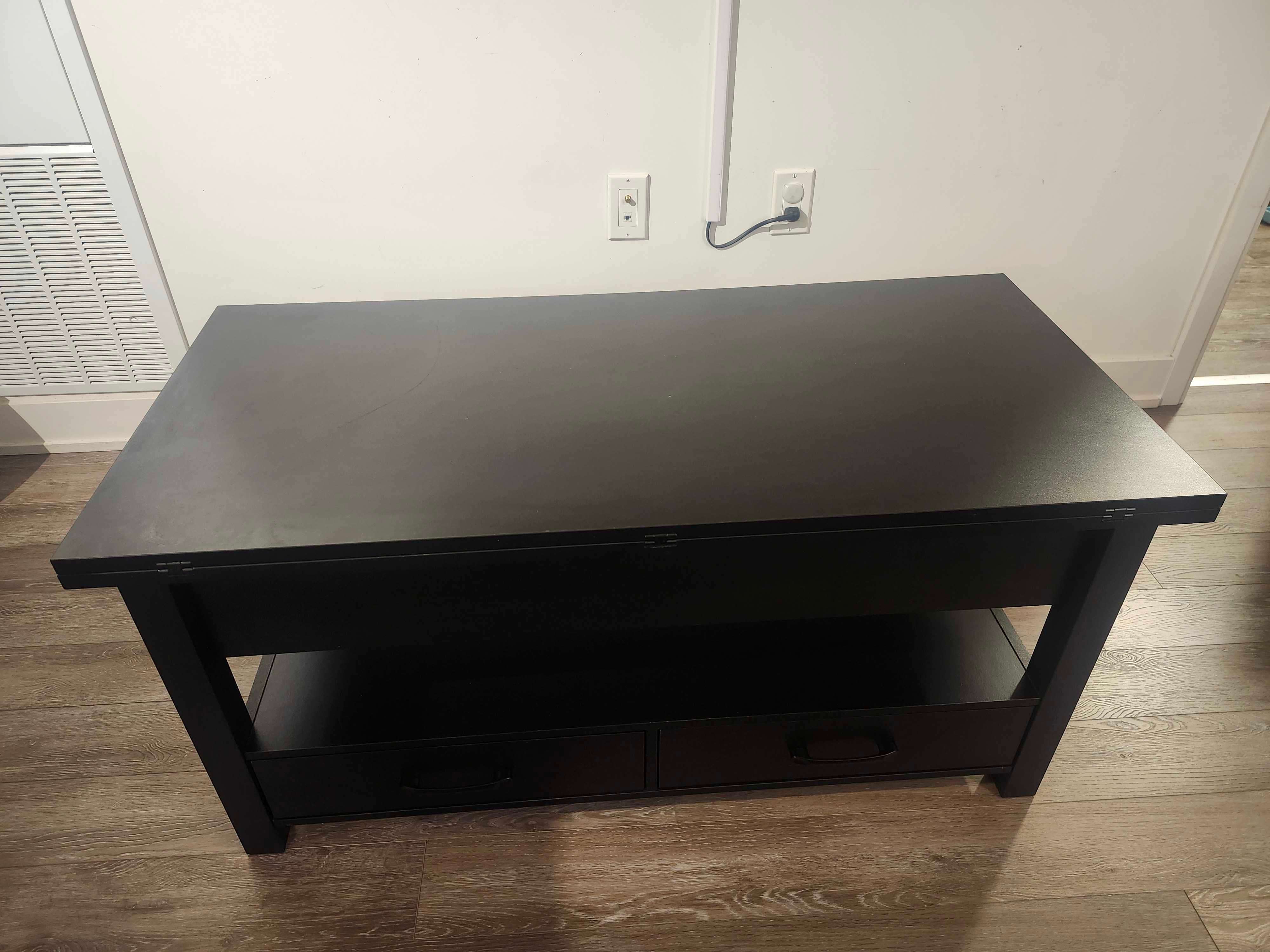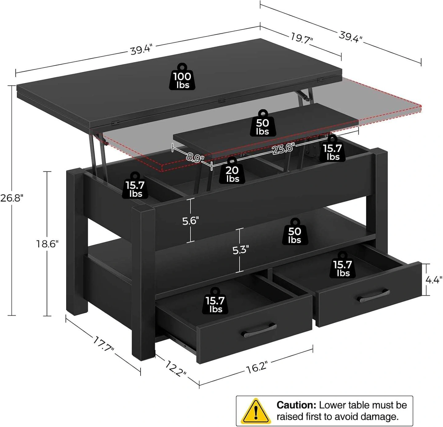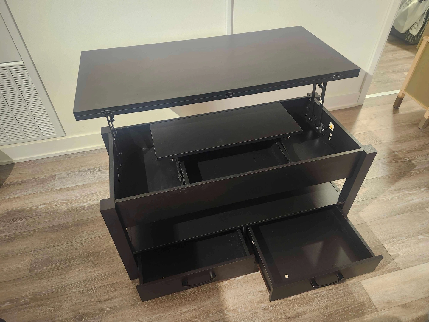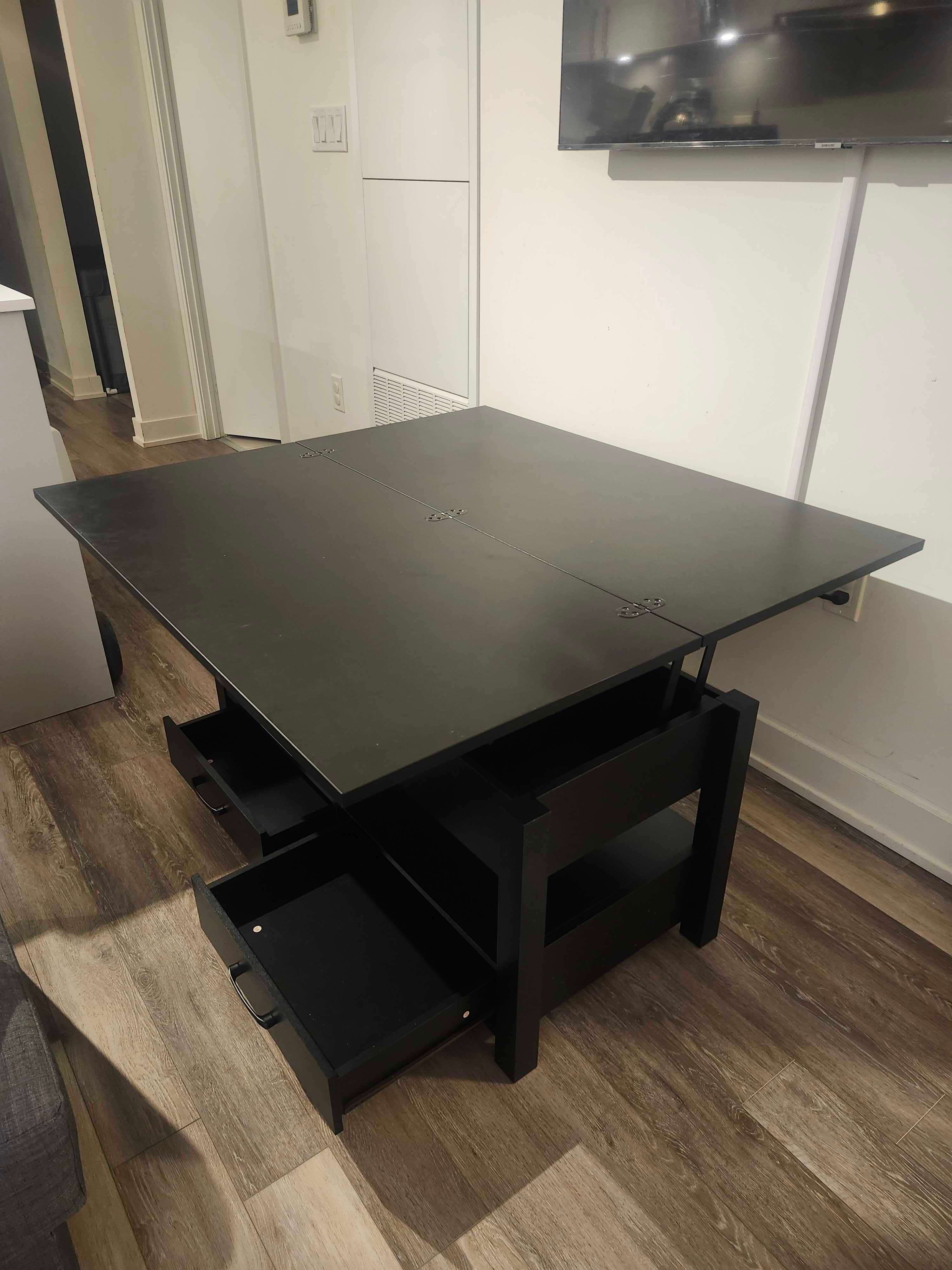 This black lift-top coffee table is perfect for small spaces! It can be used as a regular coffee table, a one-side lift-top coffee table, a two-way lift-top coffee table, or even a dining table for 4-8 people.