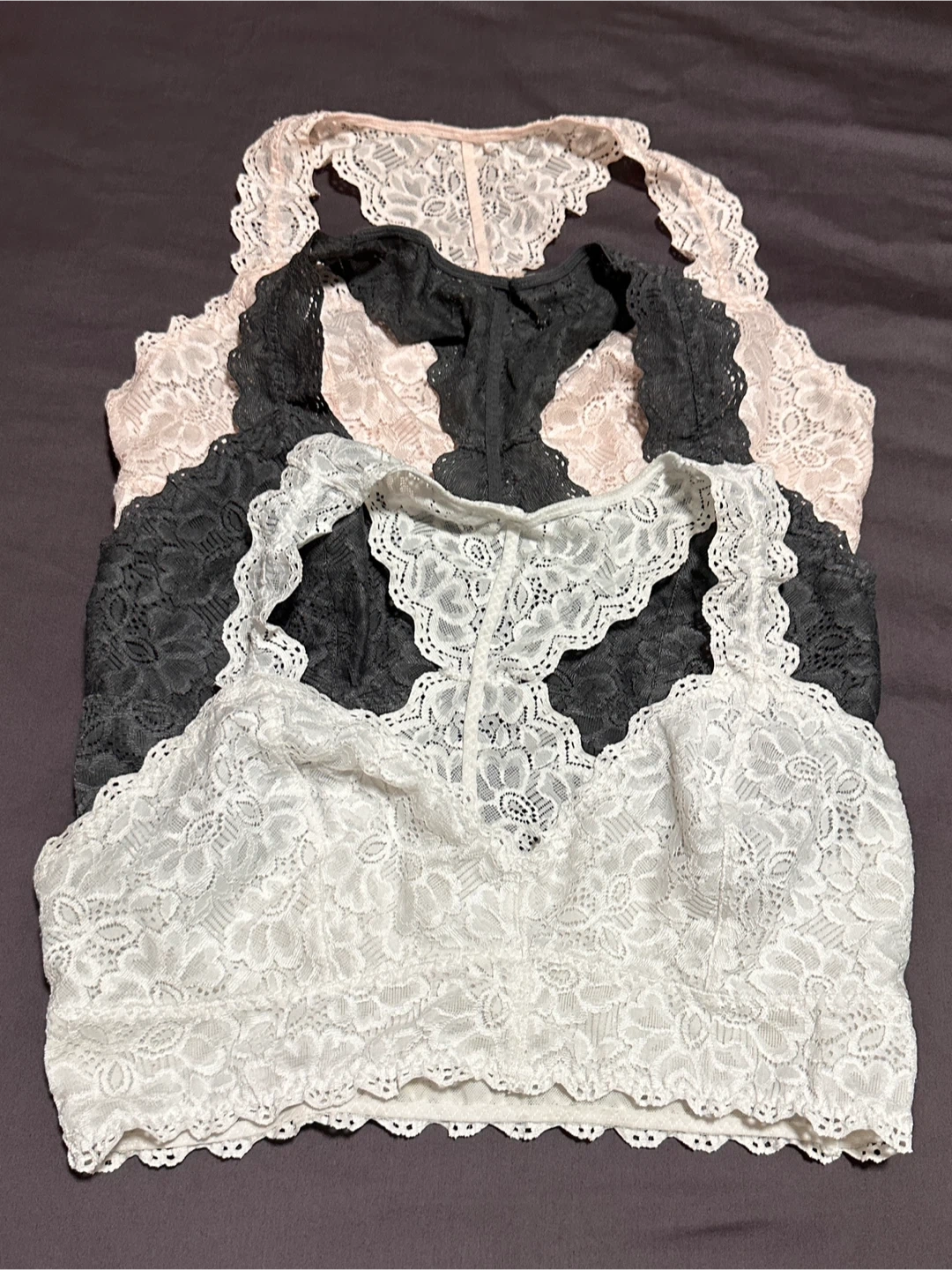 Selling these cute lace racerback bralettes! They're in great condition and come in three colours: white, black, and pink. All size M