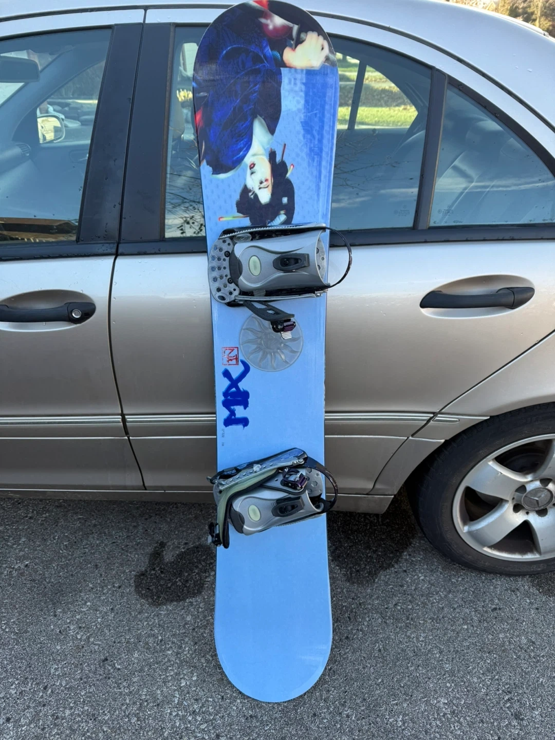 Selling a used snowboard package with bindings. Great for a beginner or intermediate rider, or someone looking for a fun board to fix up.