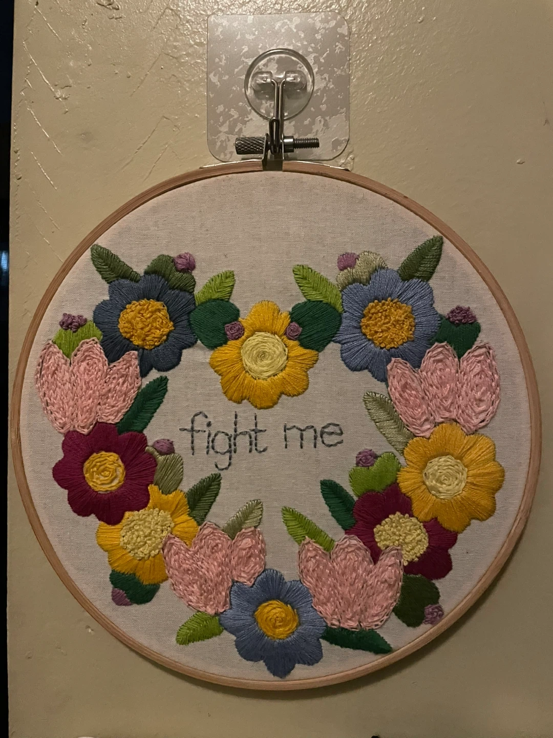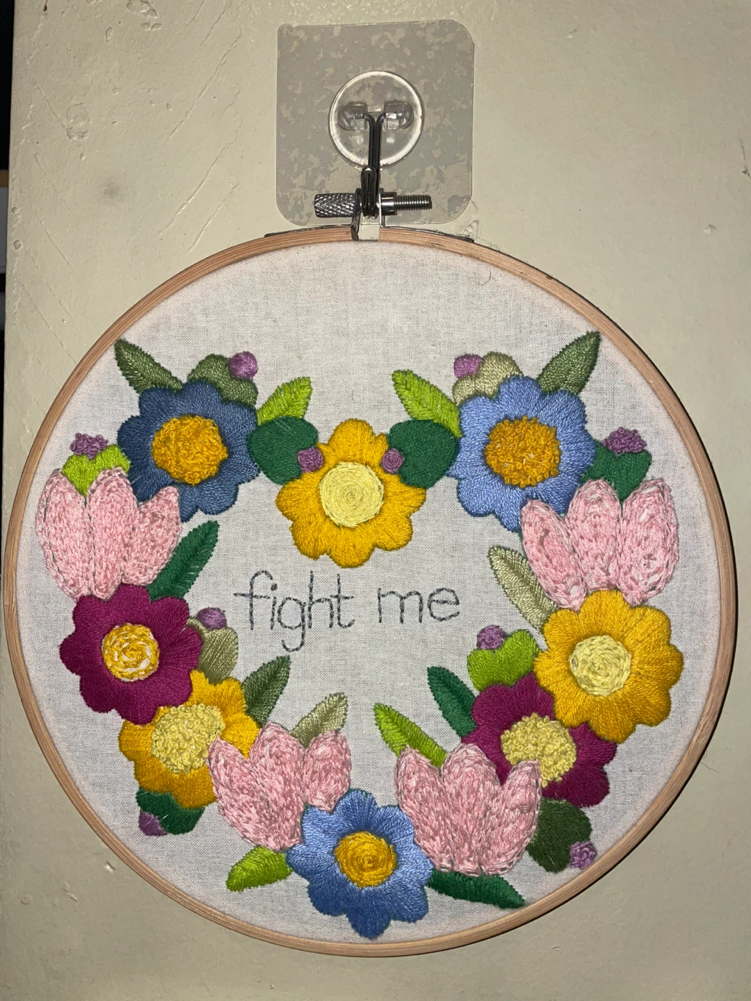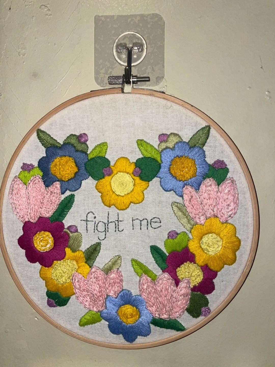 This is a handmade embroidery hoop art piece featuring a colorful floral design with the words "fight me" embroidered in the center. It's a unique and quirky piece of wall decor that would add a fun touch to any room!