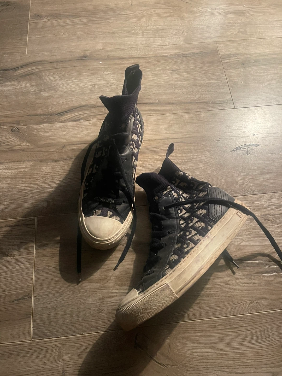 Selling a pair of Christian Dior Oblique high-top sneakers in size 39. These stylish sneakers feature the iconic Dior Oblique pattern. They show some signs of wear, as seen in the photos, but still have plenty of life left! Perfect for adding a touch of luxury to your casual outfits