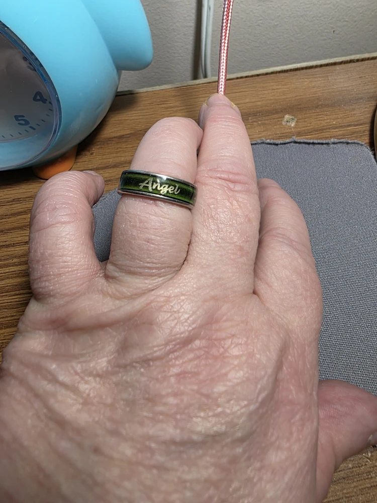 This is a unique mood ring with the word 'Angel' inscribed on it. It changes colour depending on your mood. A fun and stylish accessory!