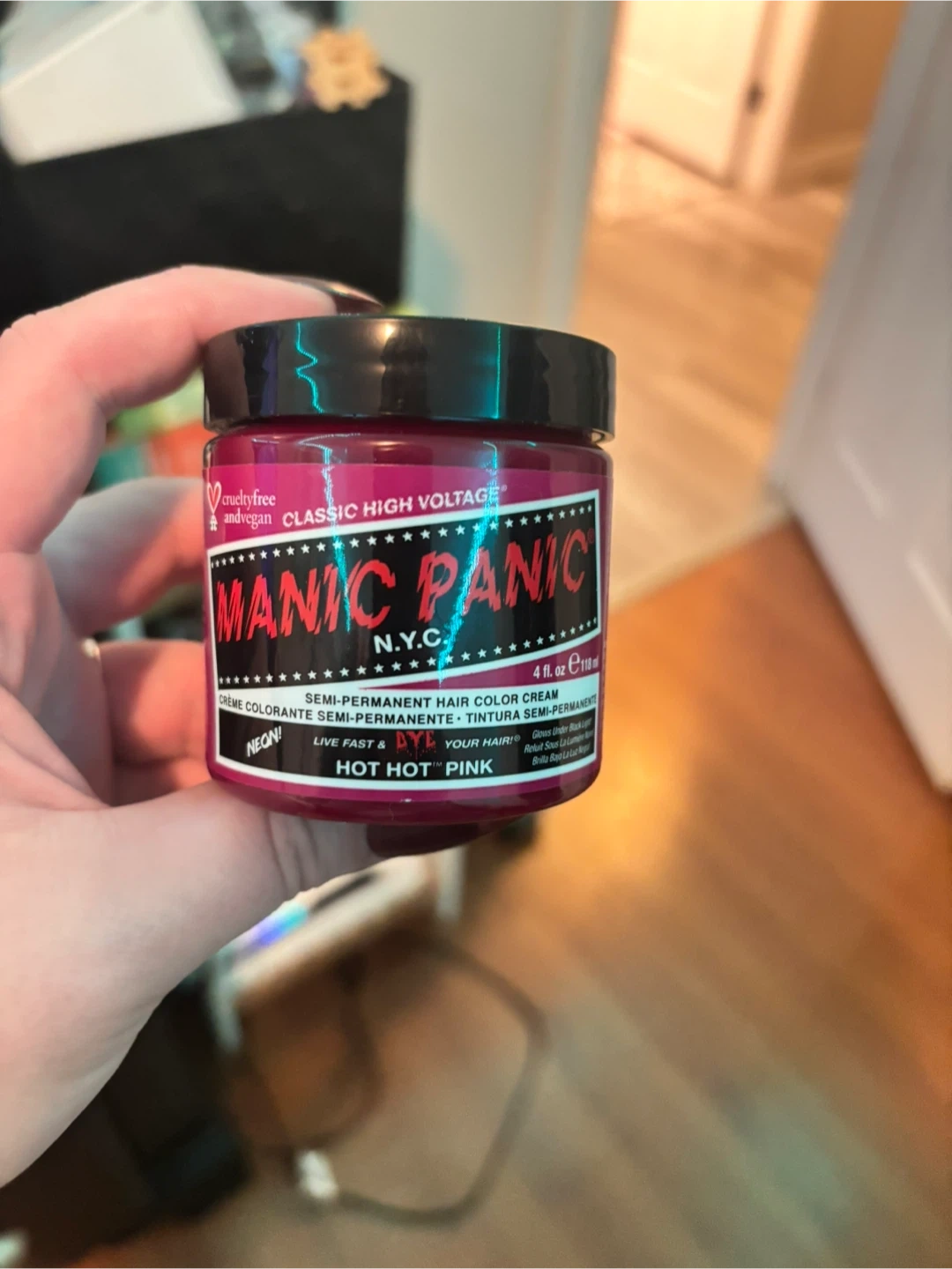 Selling a brand new jar of Manic Panic Classic High Voltage hair dye in the colour Hot Hot Pink! This is a semi-permanent hair colour cream that's also cruelty-free and vegan. It even glows under black light! Size is 4 fl oz