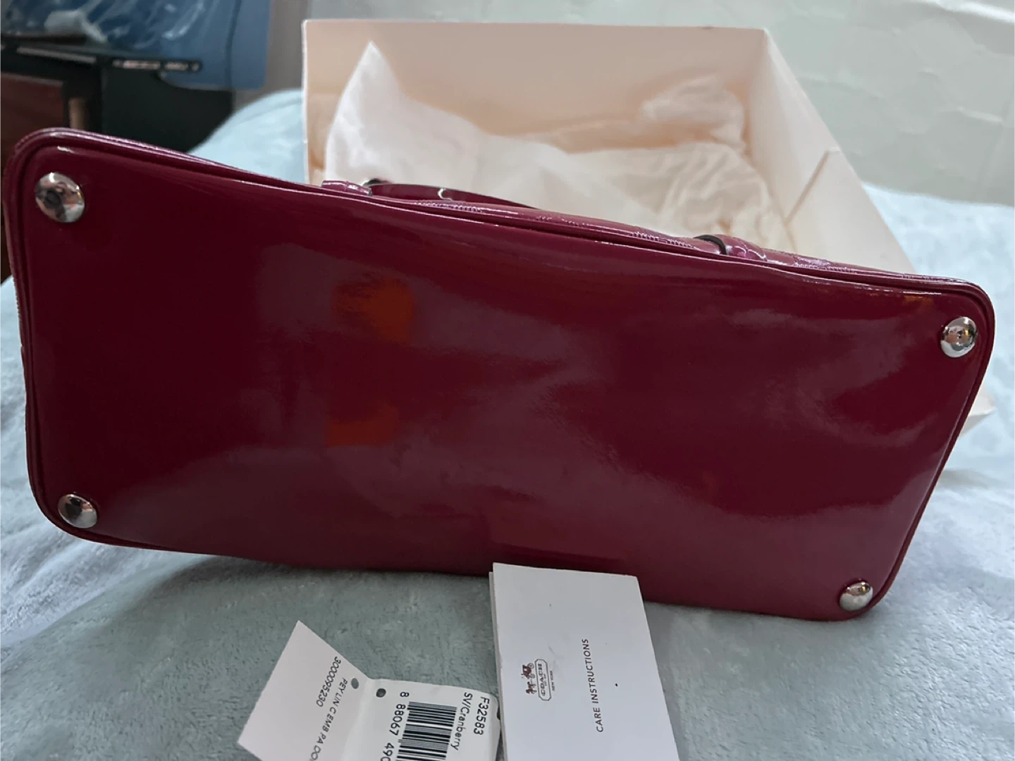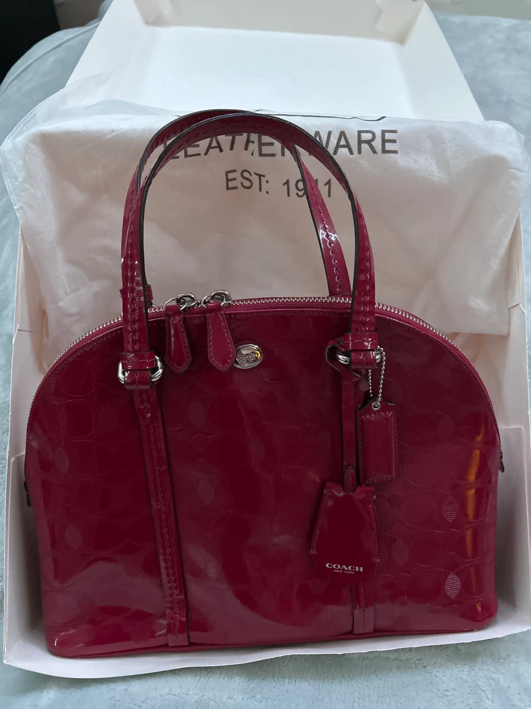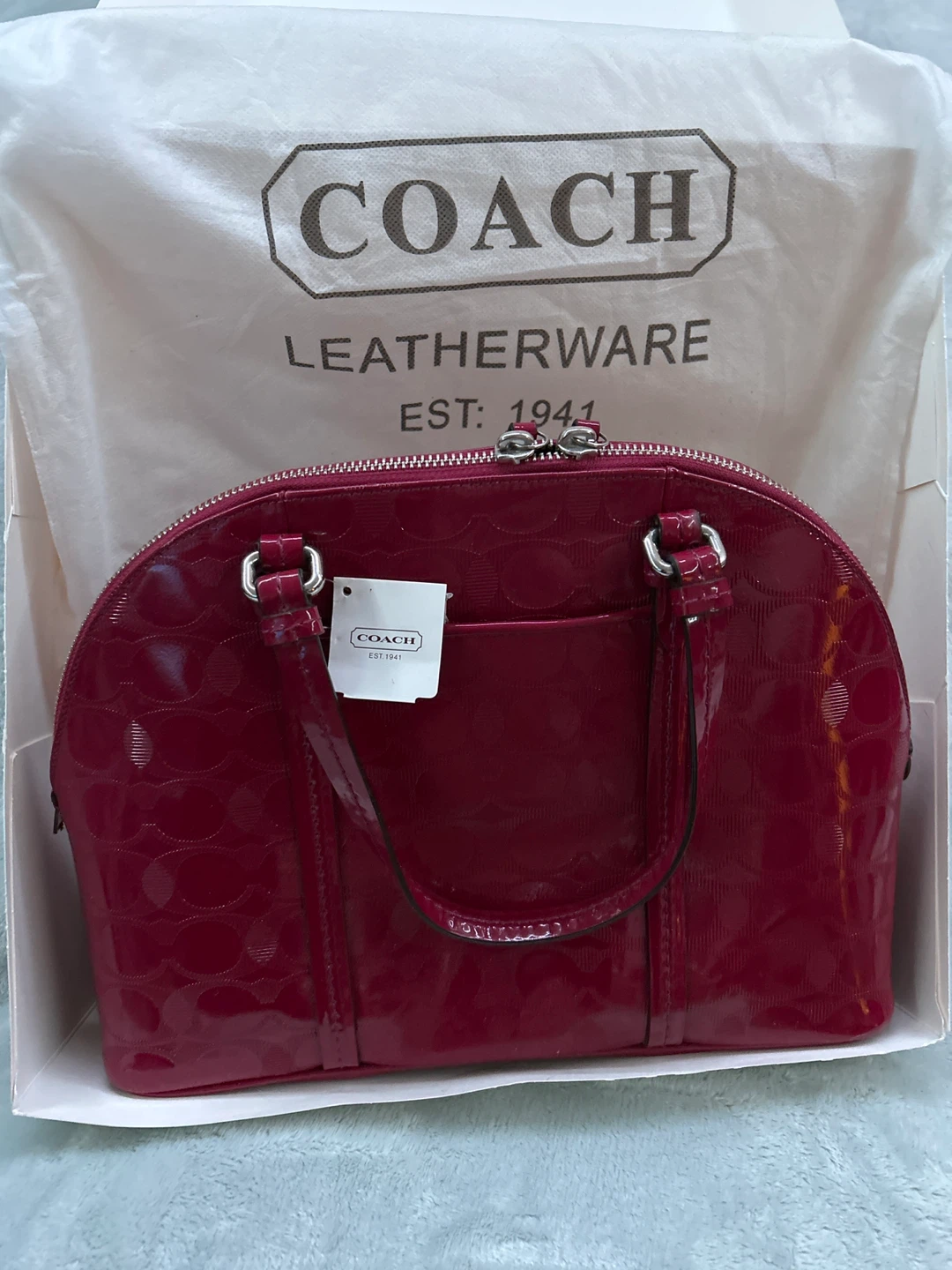 Selling a cute Coach handbag in a vibrant deep Fuchsia colour! It comes with its original box and dust bag. Perfect for adding a pop of colour to any outfit! Bag width is 13 inches; height 9.5 inches. 4 silver feet on bottom to protect bag from dirt and stains. In very good condition