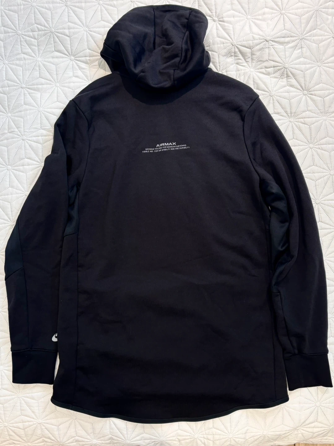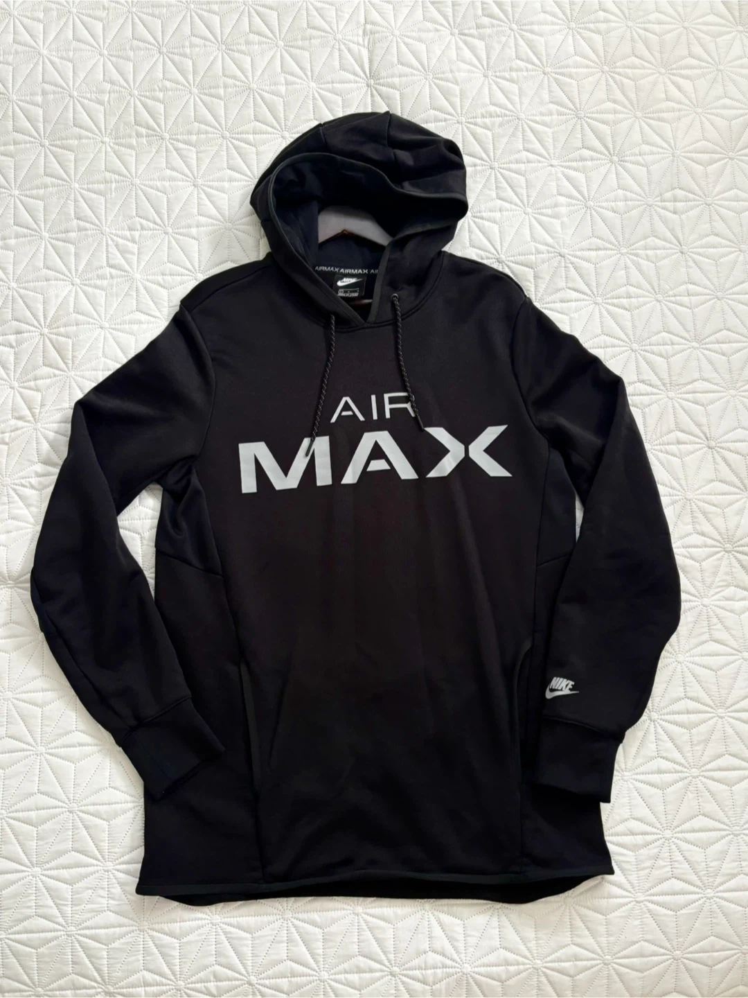 Selling a Nike Air Max hoodie in black. It's a women’s size large and in great condition. Features the Air Max logo prominently on the front and detailing on the back. Perfect for staying comfy and stylish!