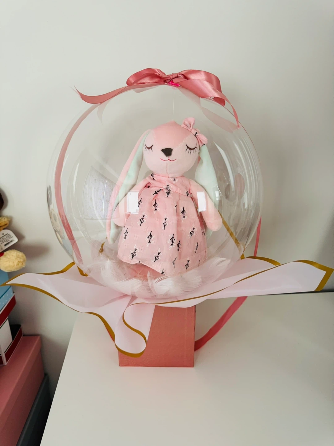 A cute pink bunny stuffed animal inside a clear balloon, decorated with a pink ribbon and sitting on a pink base. It's in great condition and ready to brighten up any room!