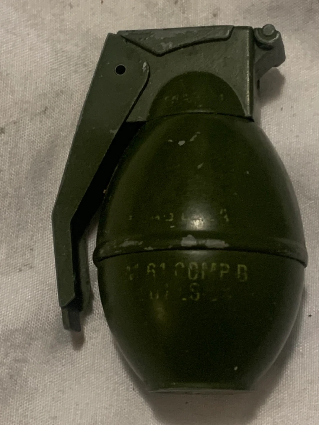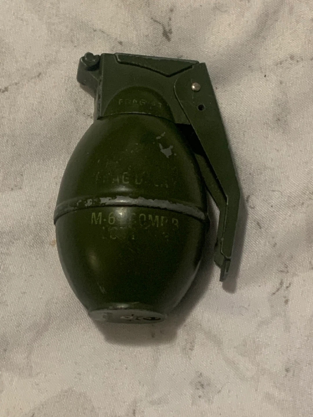 This replica M-61 grenade is a lighter. It has "FUZE M204 GRE2 SLICK" & "M-61" markings. Great for display/collection or re-fill & use it as a lighter! 🔥 currently it’s out of lighter fluid.
