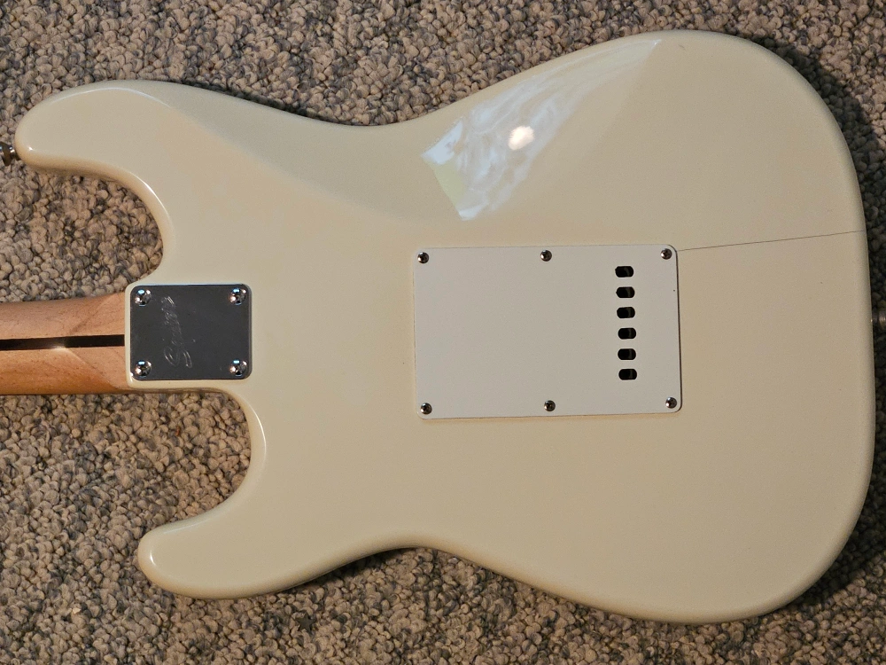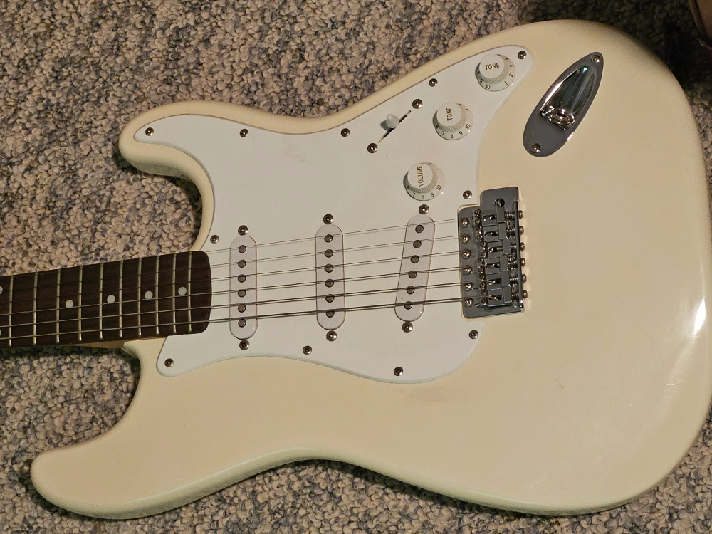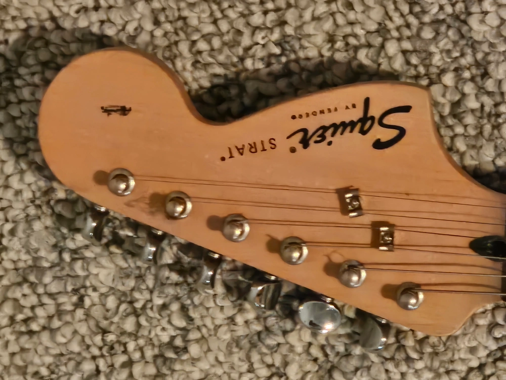 Selling a Squier Strat electric guitar in a cream colour. It's in great shape and ready for a new home. Perfect for beginners or experienced players alike!