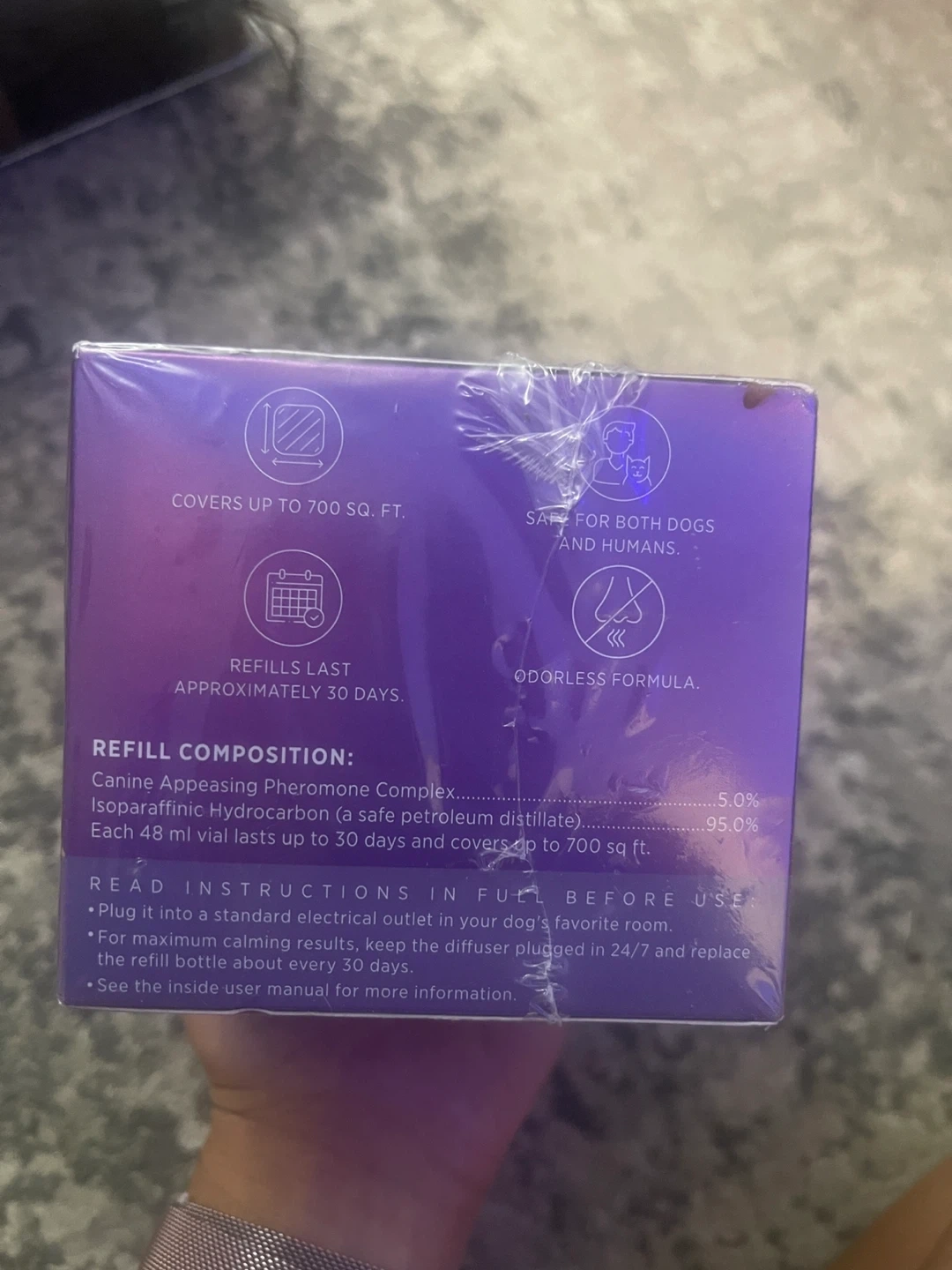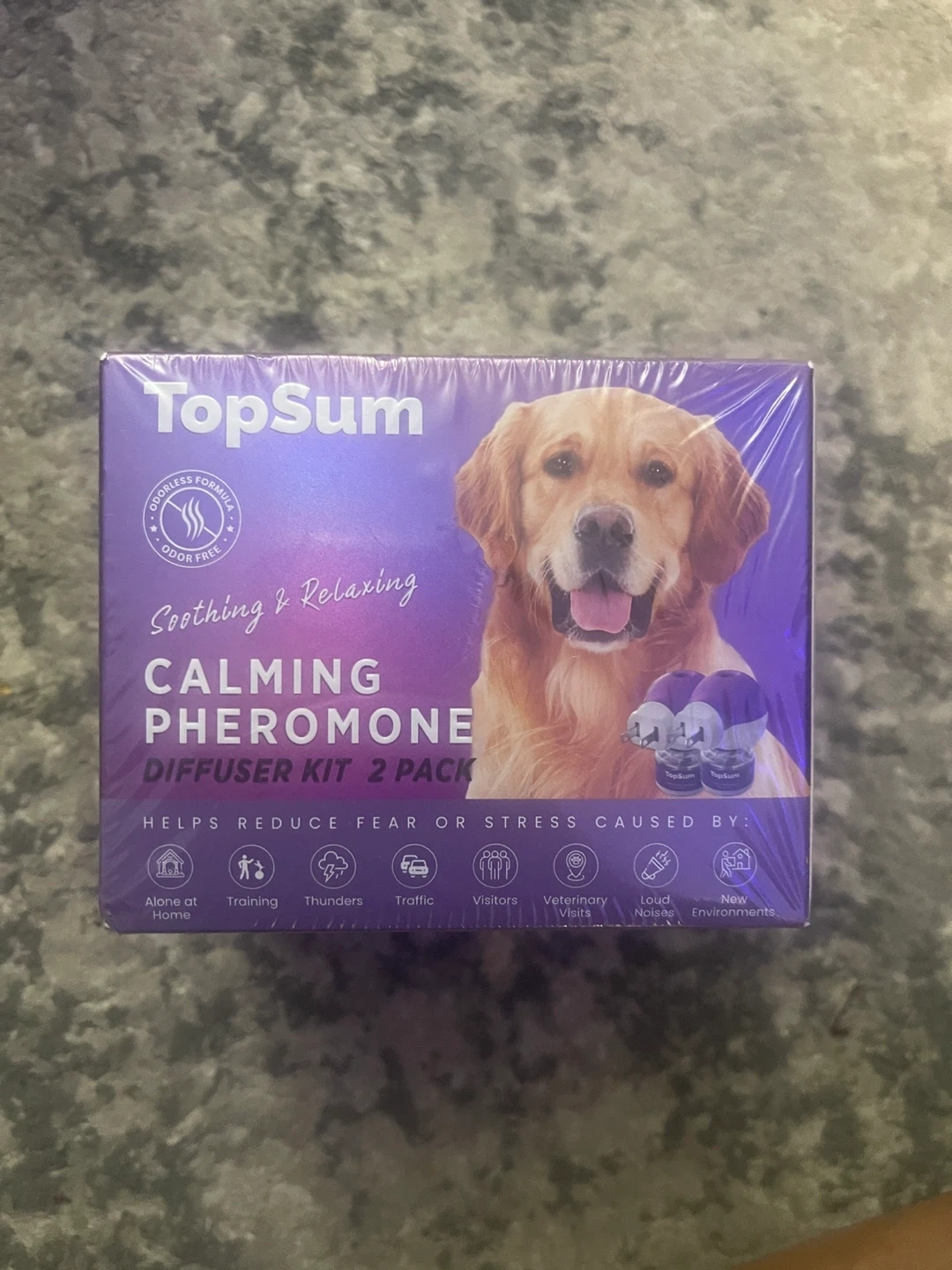 Selling a Topsum calming pheromone diffuser kit, which helps reduce fear or stress caused by things like thunder, traffic, or new environments. It's safe for both dogs and humans and covers up to 700 sq ft. The refills last approximately 30 days and the formula is odorless