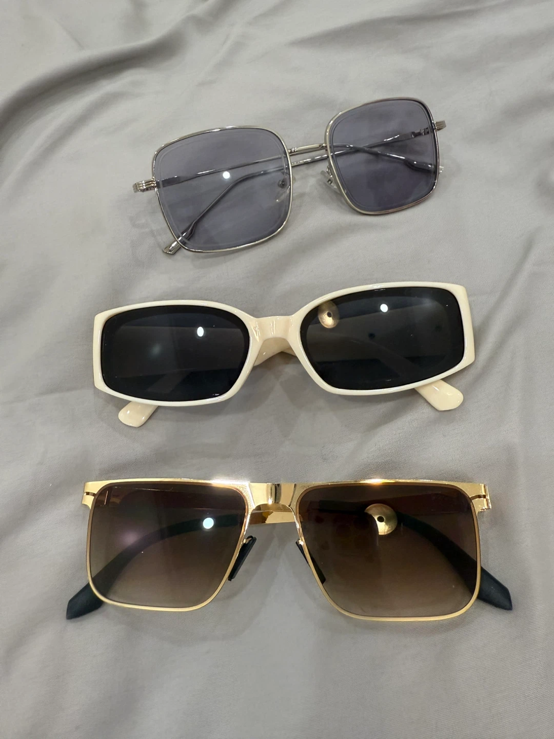 Selling a set of three stylish sunglasses! There's a pair with silver frames and grey lenses, another with white frames and black lenses, and a third pair with gold frames and gradient brown lenses. They're all in great condition and ready for a new home