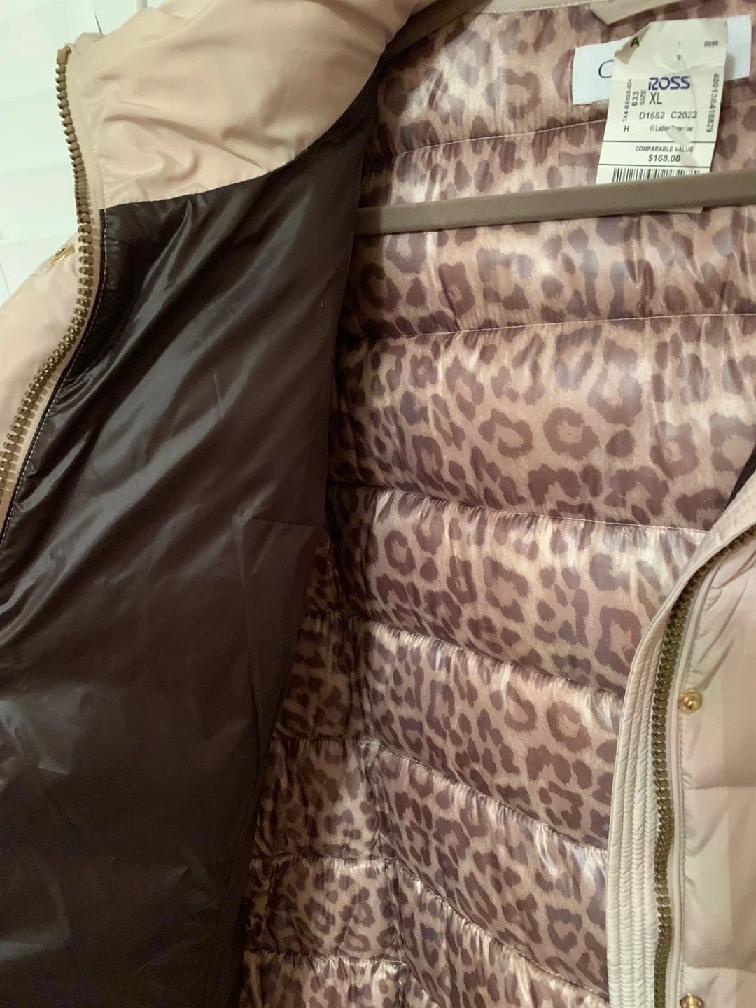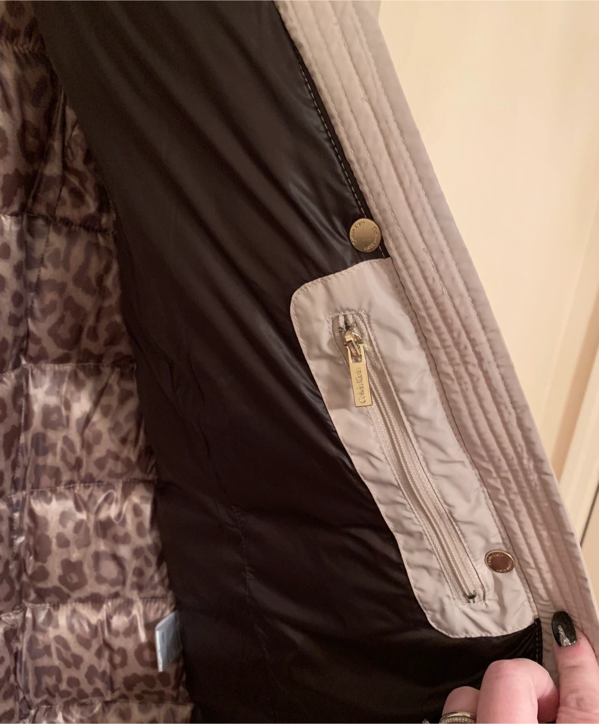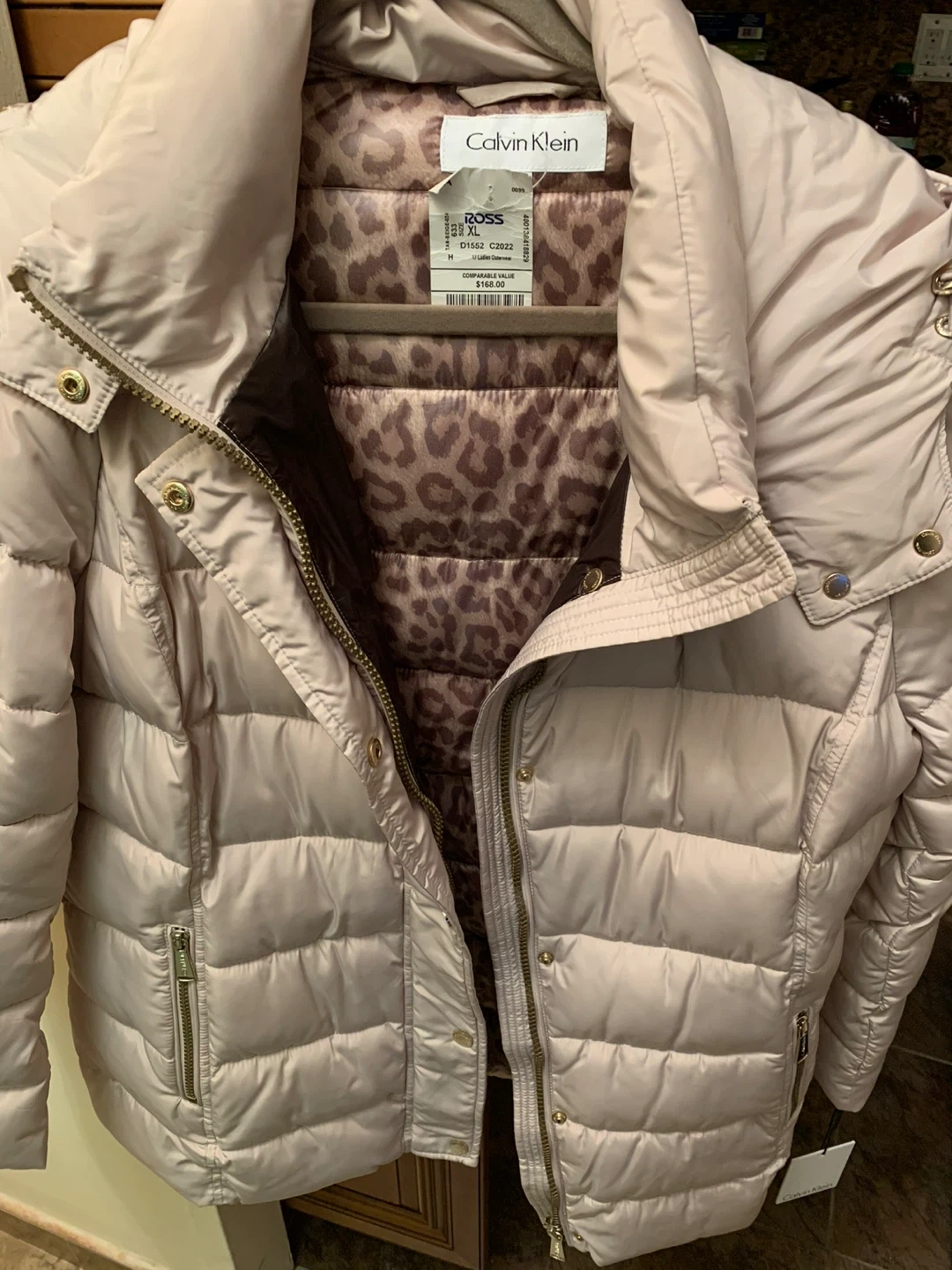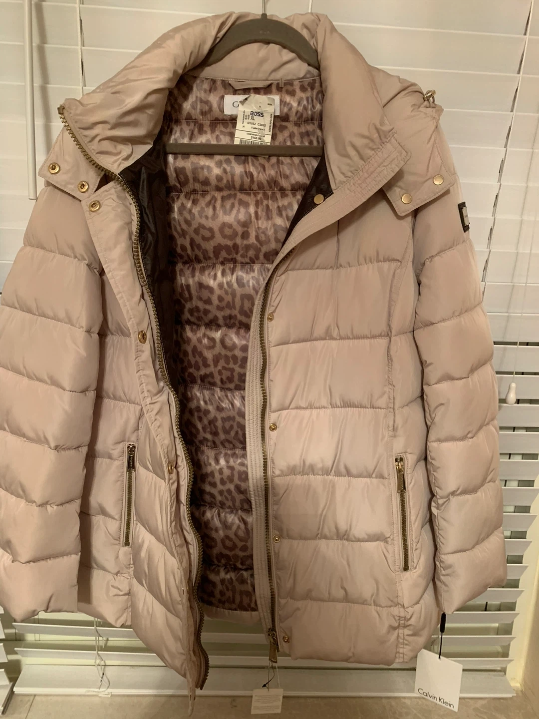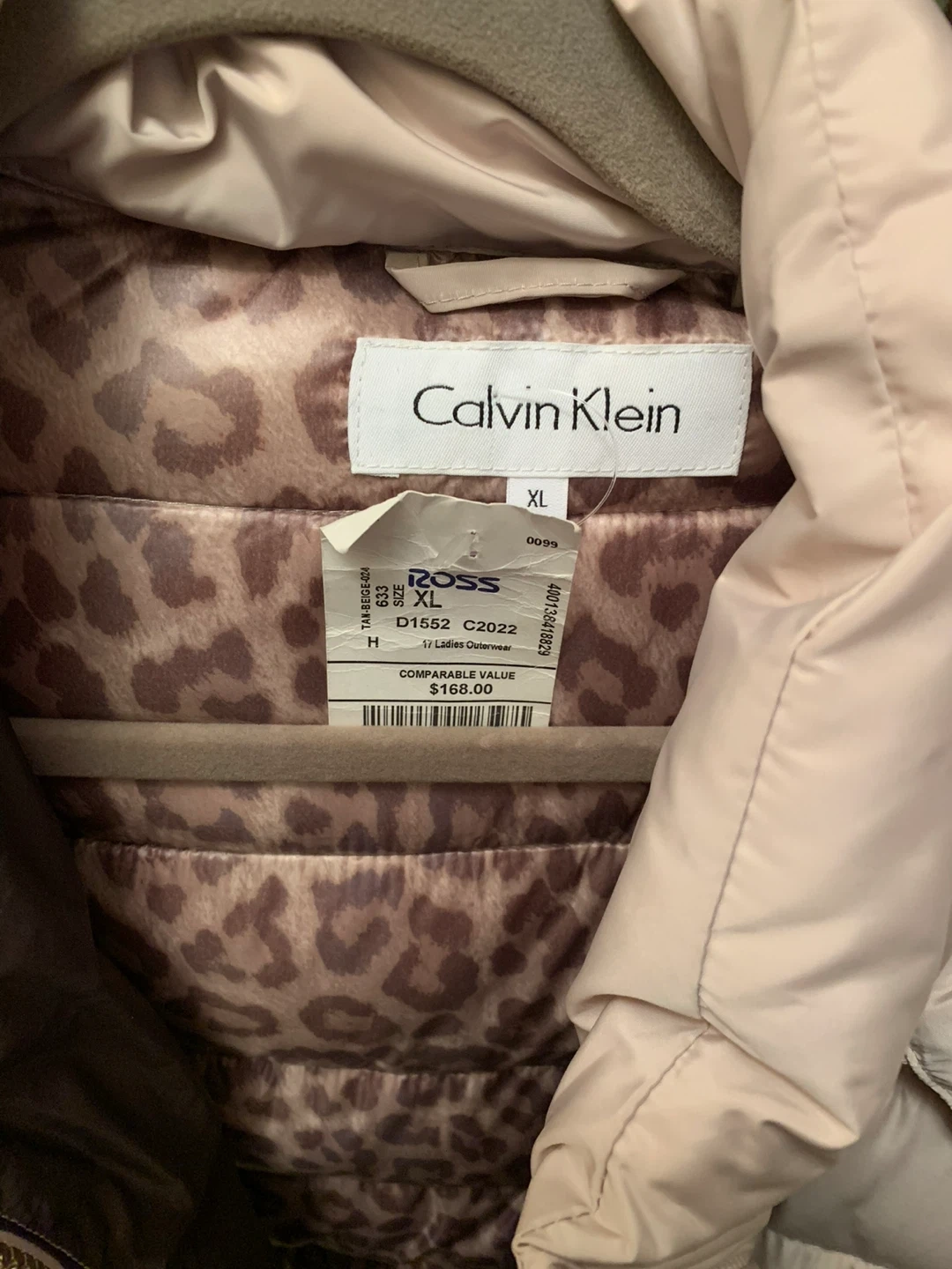 Selling a Calvin Klein puffer jacket in size XL. It's a stylish and warm jacket with a unique leopard print lining. Perfect for staying cozy during the colder months!