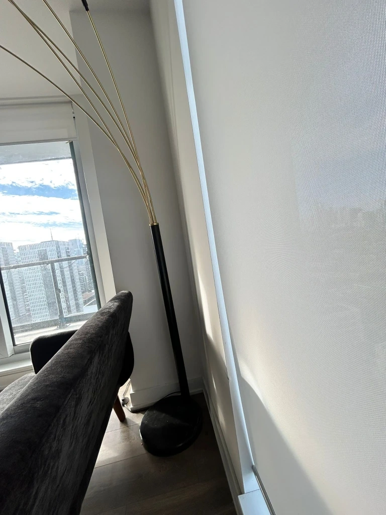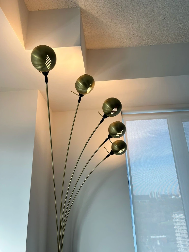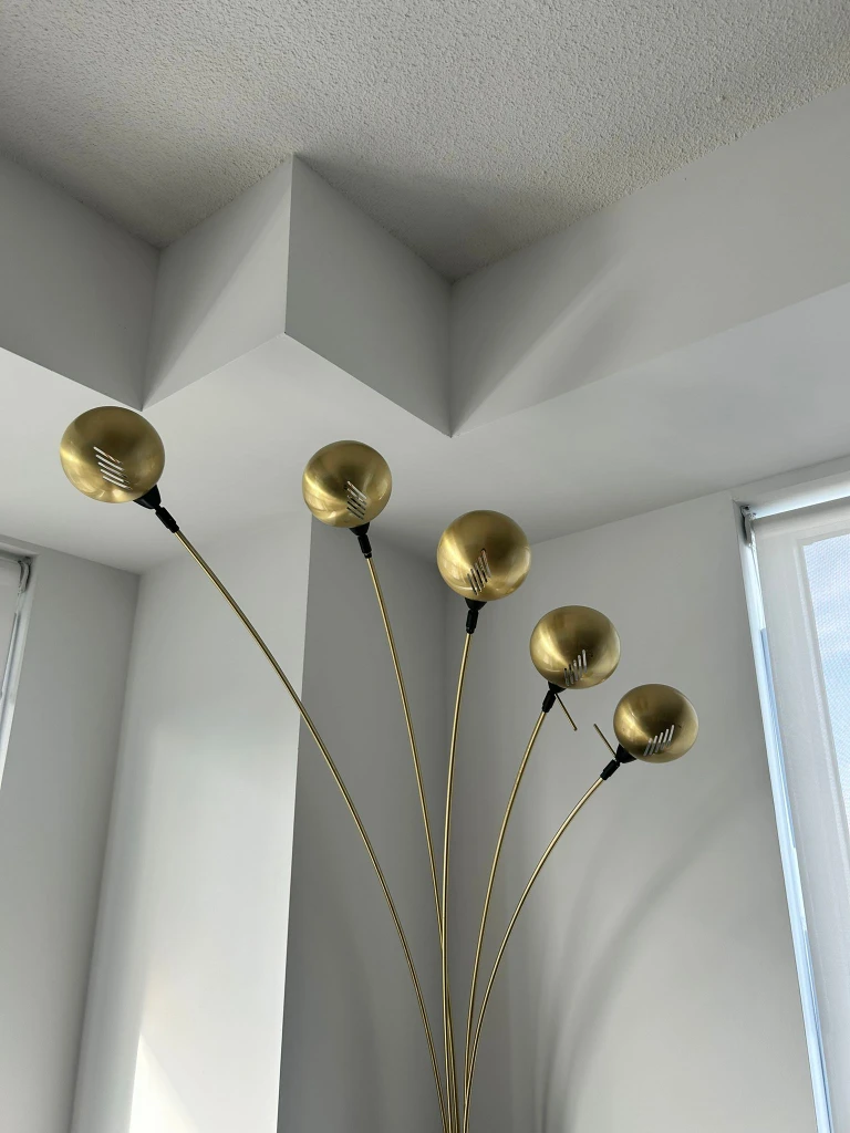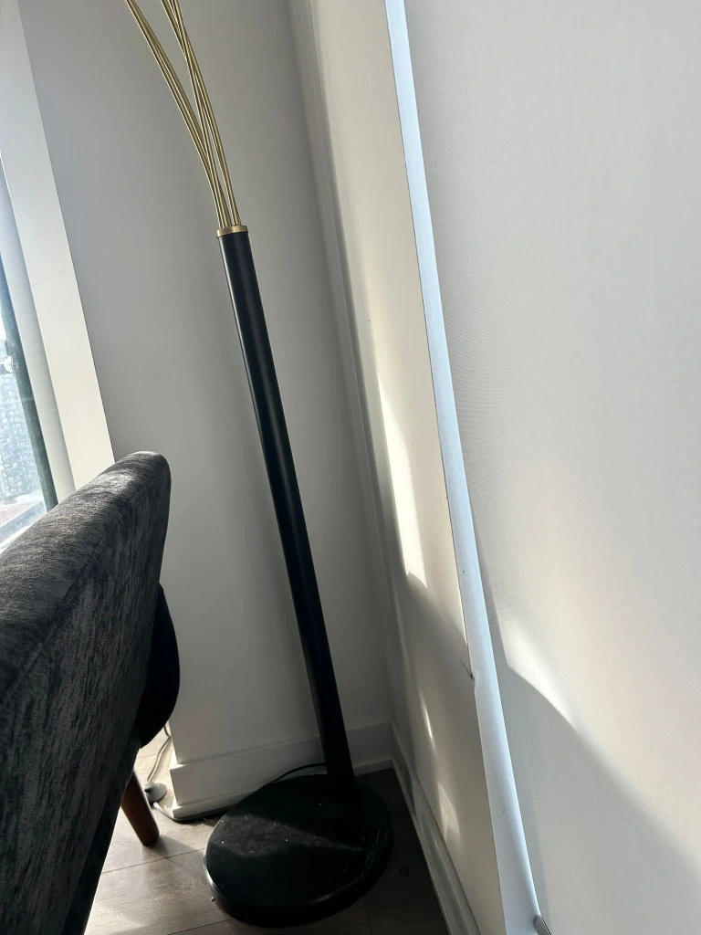 Selling a modern floor lamp with a sleek design! It features brass arms and black accents, giving it a stylish look. It would be a great addition to any living space